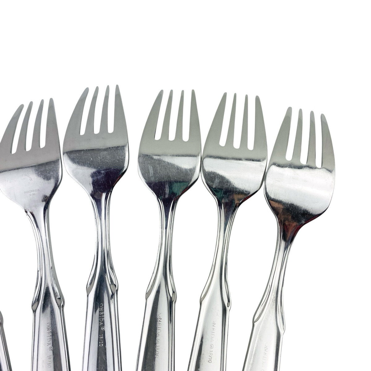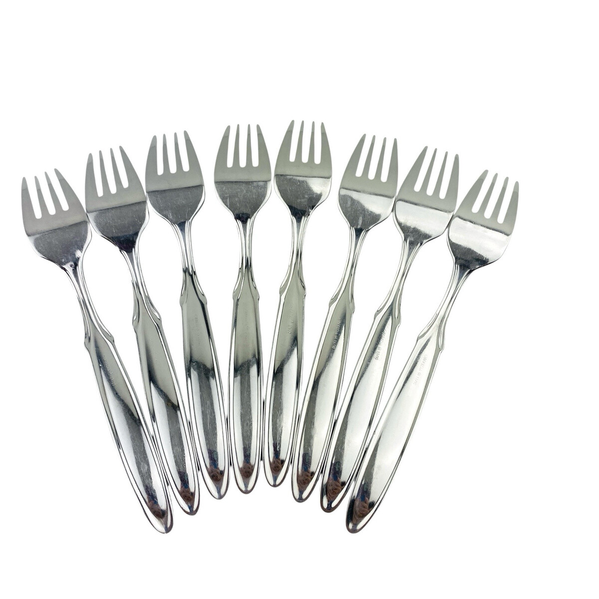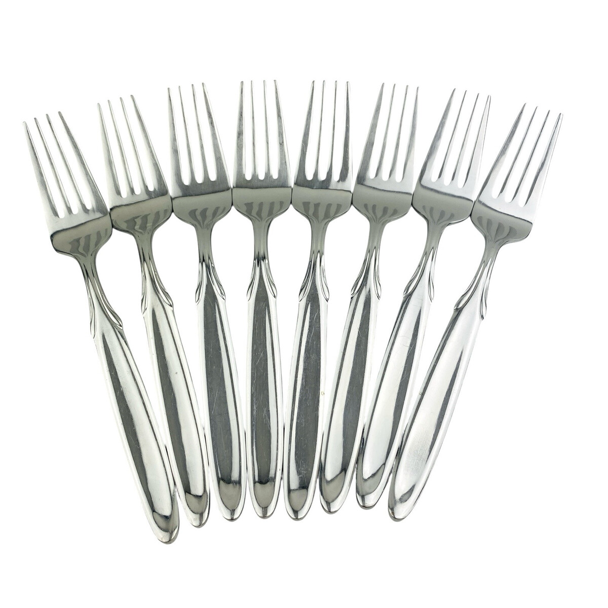 Set of eight Oneida Berkshire Salad Forks. Stainless 18/10. Glossy. The forks measure 7 1/4? long. The forks are in good preowned condition with moderate wear from use; please see pictures for exact condition details. Ships next day!