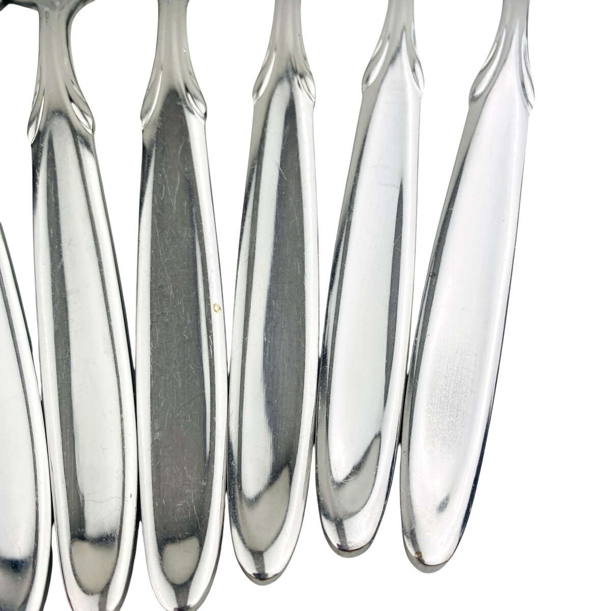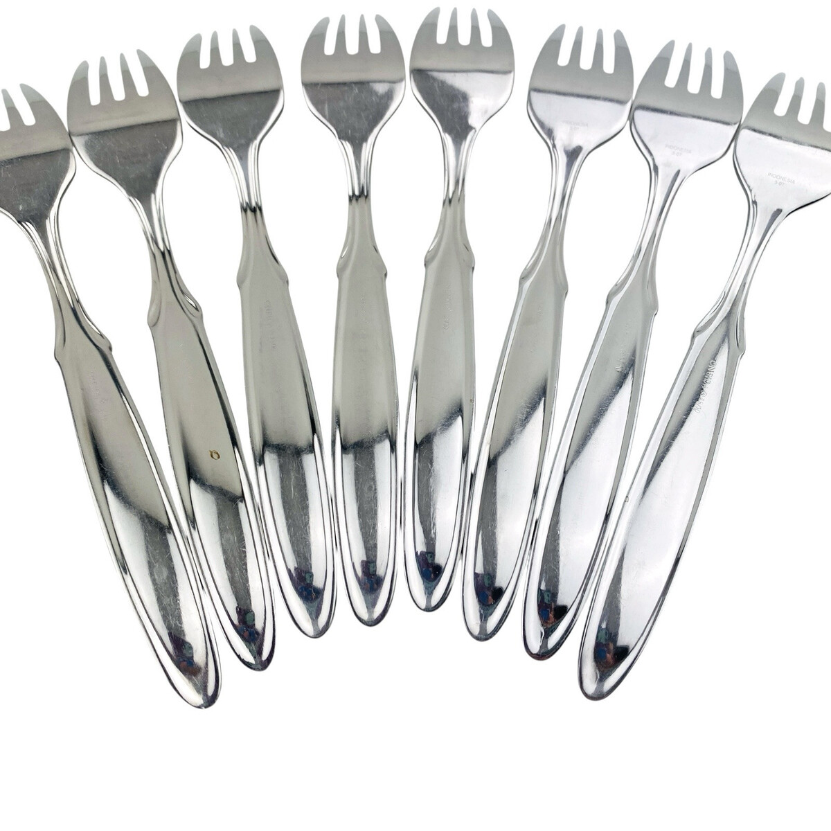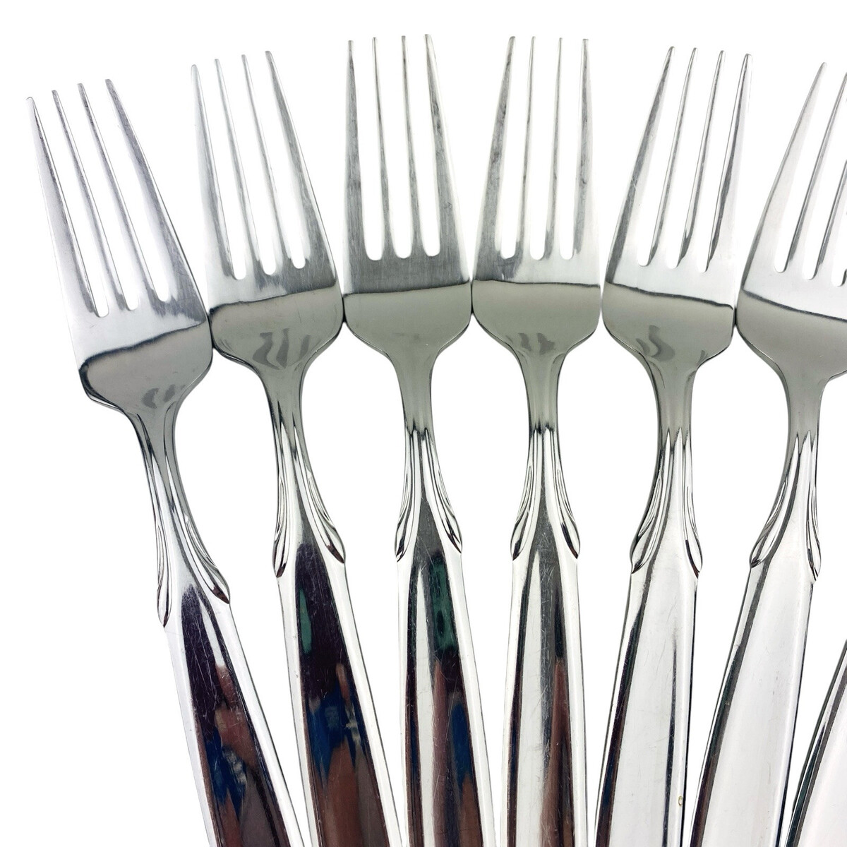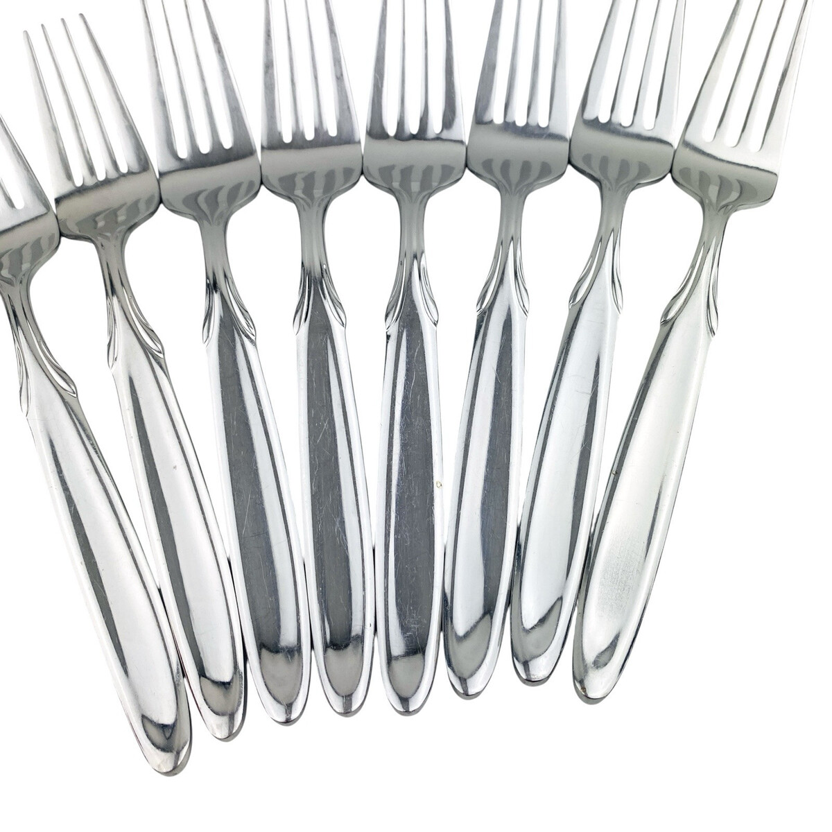Set of eight Oneida Berkshire Salad Forks. Stainless 18/10. Glossy. The forks measure 7 1/4? long. The forks are in good preowned condition with moderate wear from use; please see pictures for exact condition details. Ships next day!