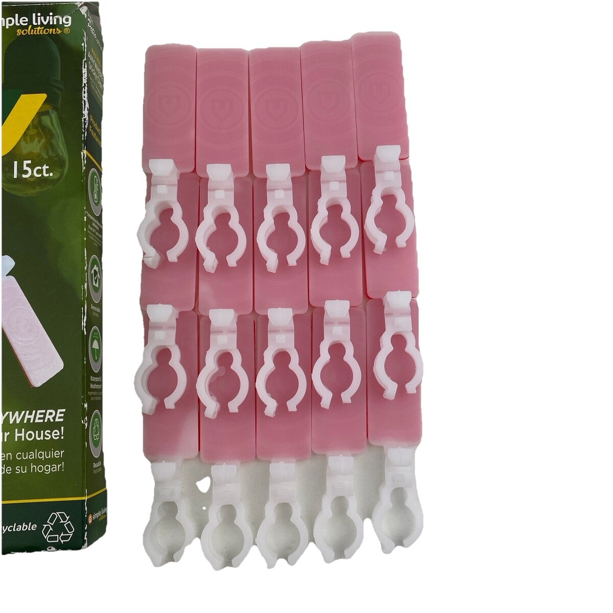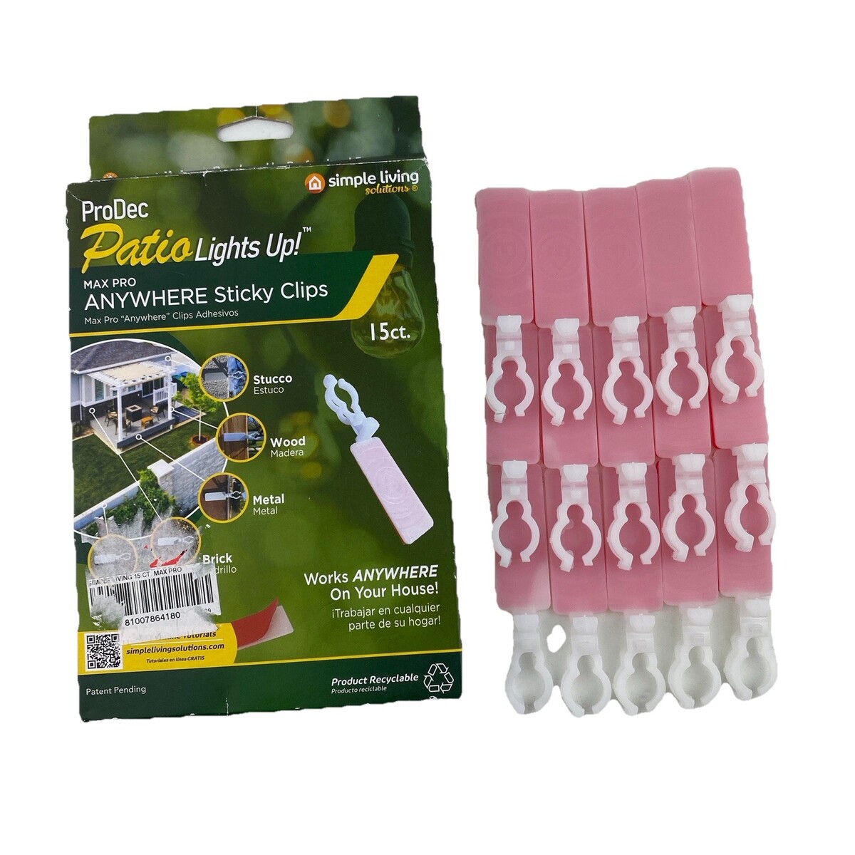 One box of 15 ProDec Patio Lights Up! Max Pro Anywhere Sticky Clips. Works on brick, stucco, wood, metal. Full box holds 20-30 lbs when used together per instructions. Box has moderate wear. Ships next day!