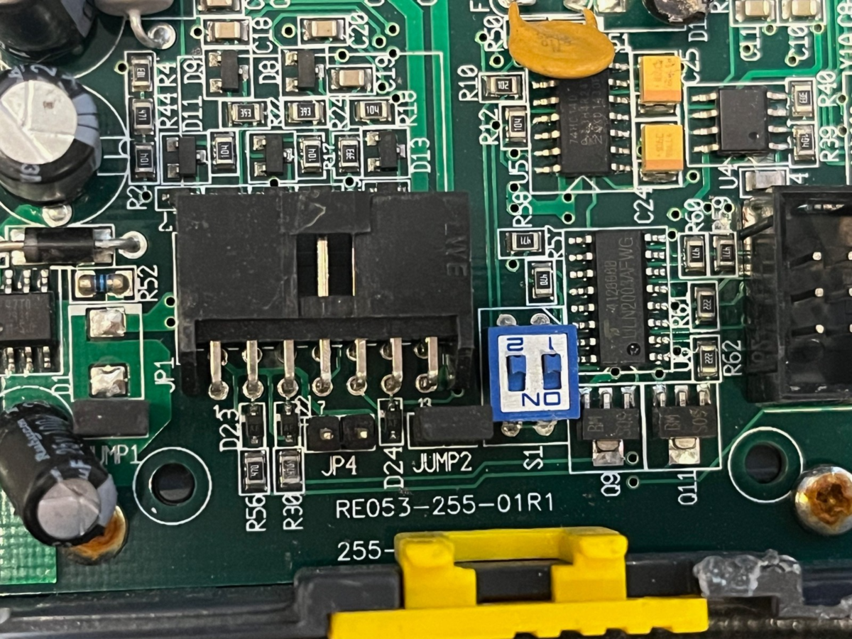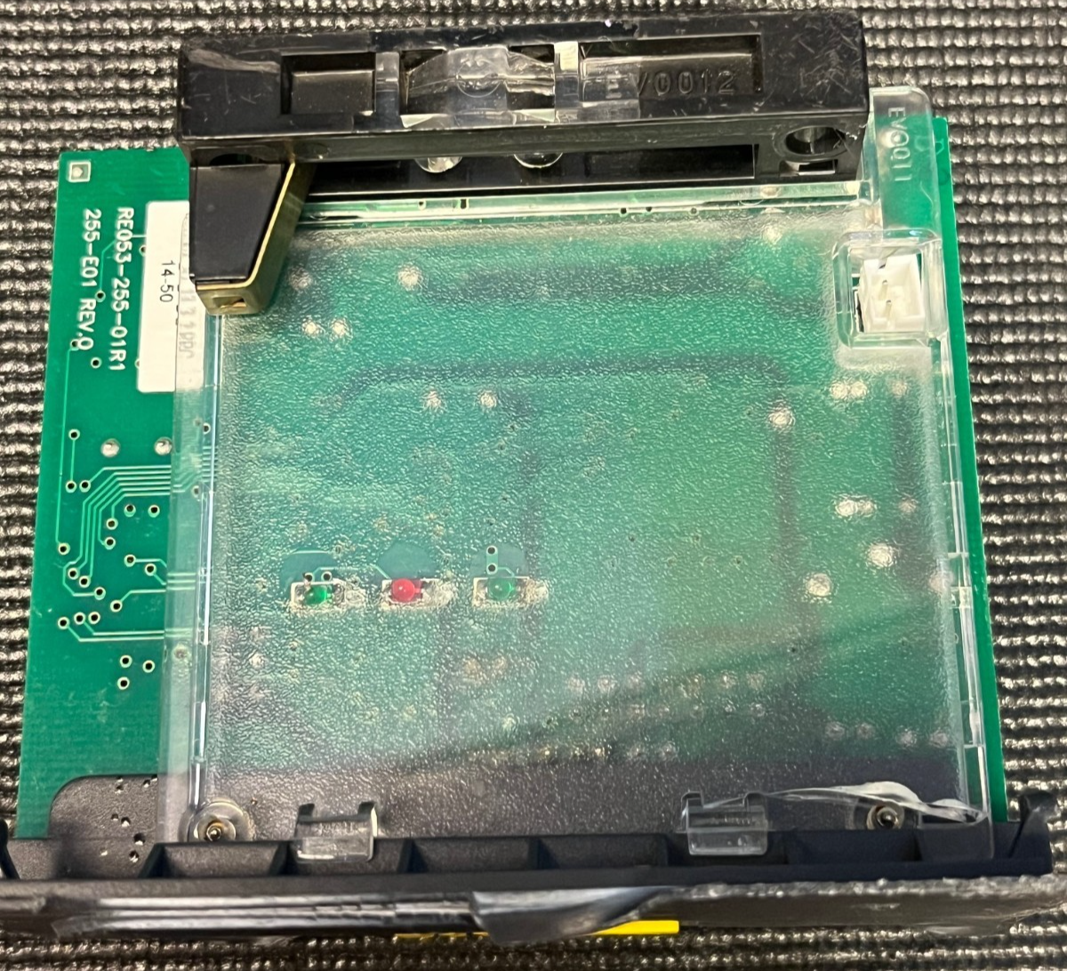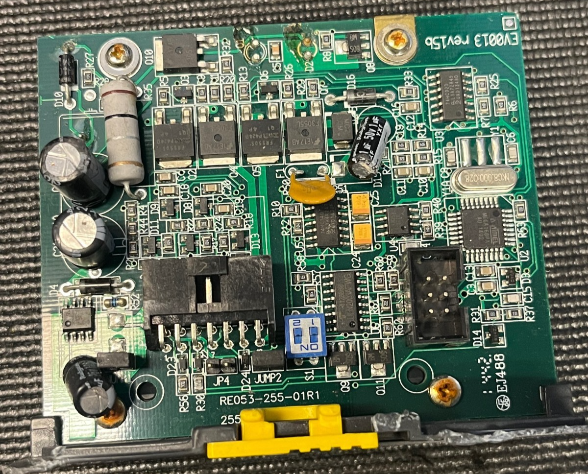 Board markings read EV0013 Rev15B and RE053-255-01R1 / 255-E01, so please verify these numbers match your existing Evolution Yellow Stripe hopper PCB before purchasing