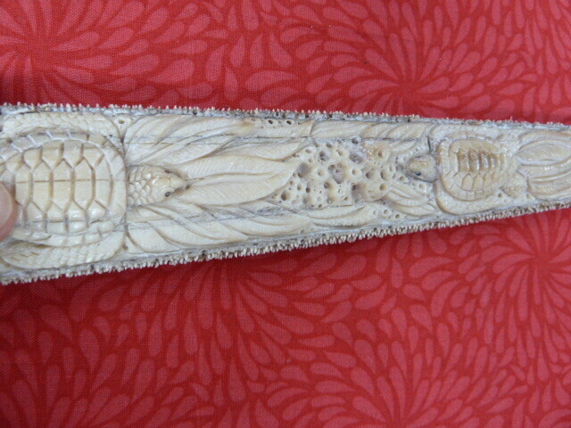 (#TURT-SEA-56) This is a Genuine Marlin fish bill carved on front full of four LARGE sea turtles and coral and seaweed background; back is sanded smooth.