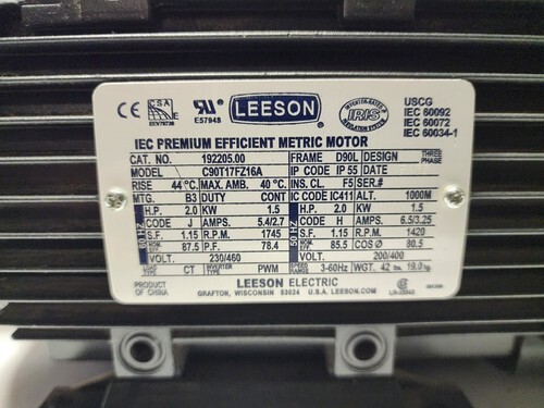Leeson Cat. 192205.00 1.5 kw/2 hp Electric Motor 230/460 V. 1745 RPM D90L Frame. Inverter Duty.