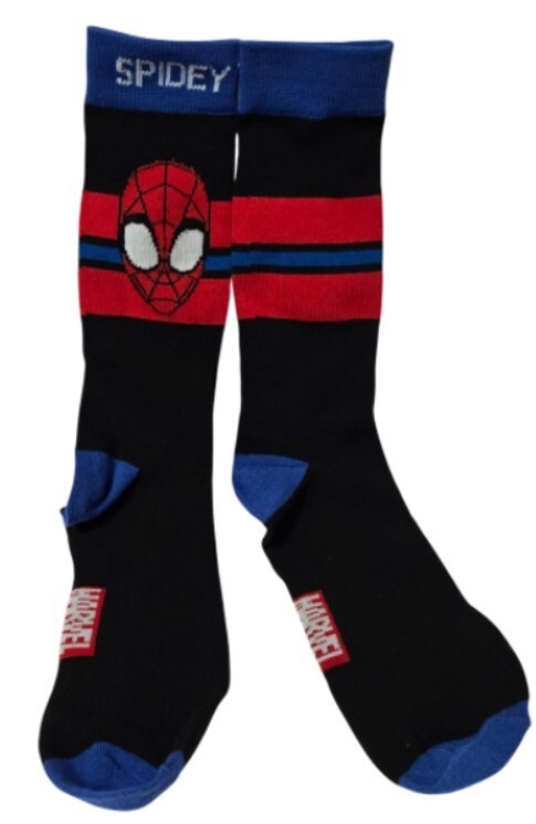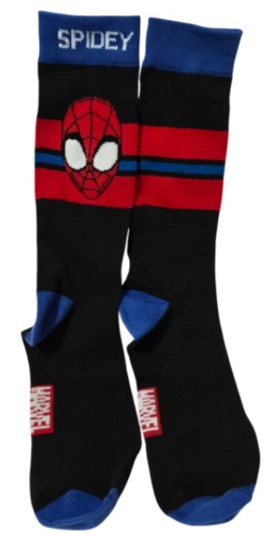 The socks feature a red and blue Spider-Man mask graphic across the top with "SPIDEY" written in white lettering on the blue cuff.