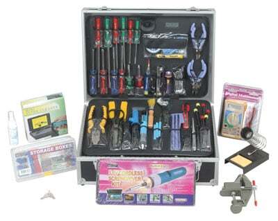 Comprehensive kit designed especially for field technicians and engineers. Ideal for anyone who tests, troubleshoots, maintains or repairs delicate electronic circuits and components. The tough aluminum case organizes and protects tools.