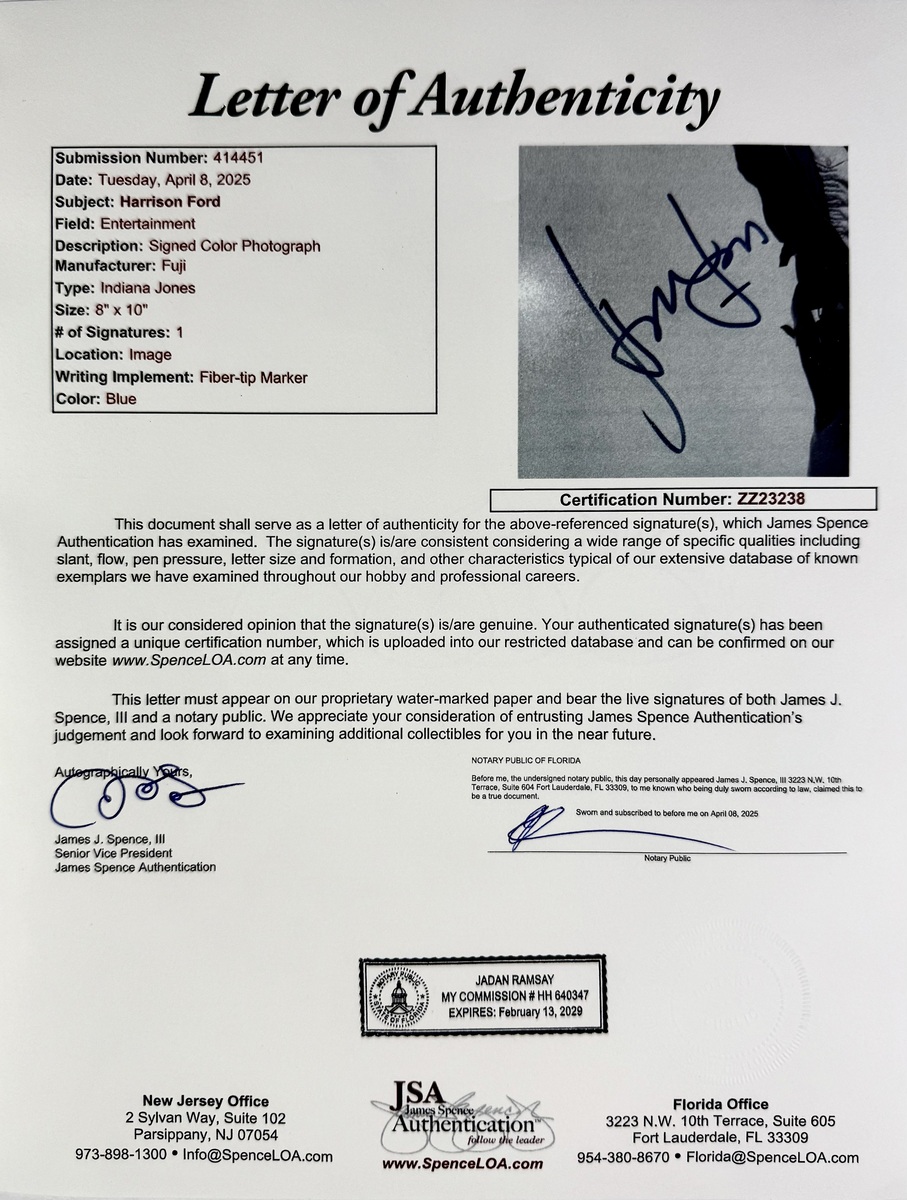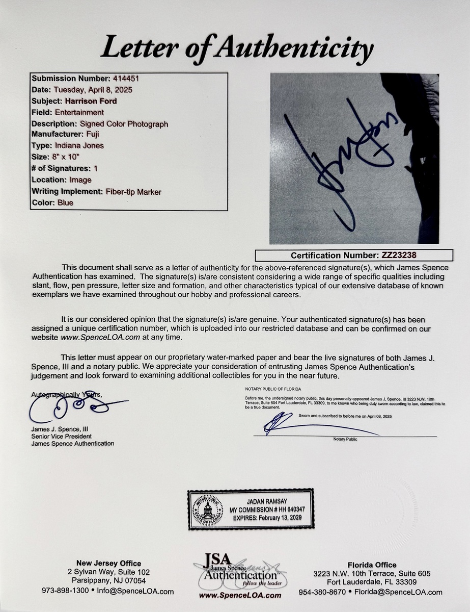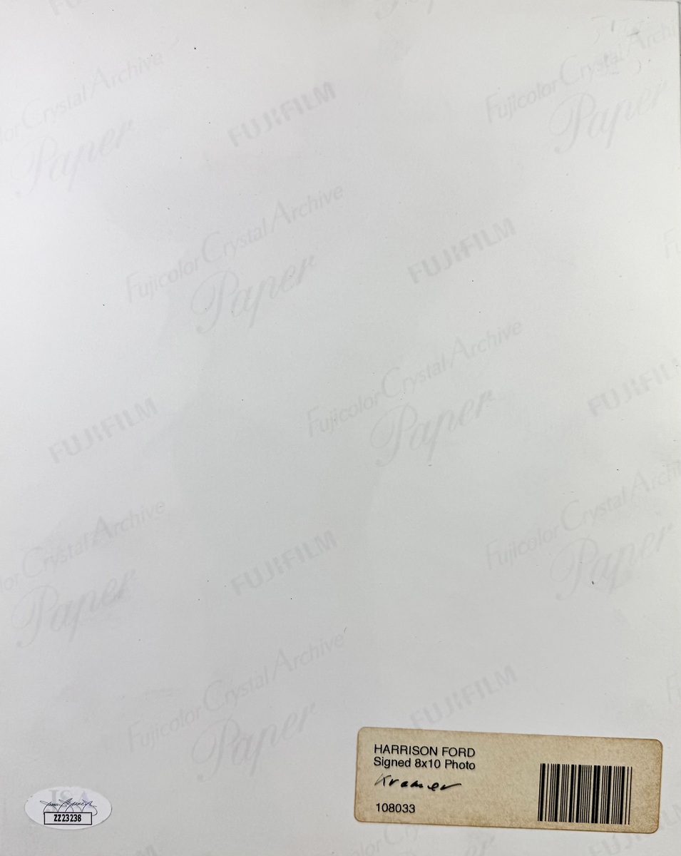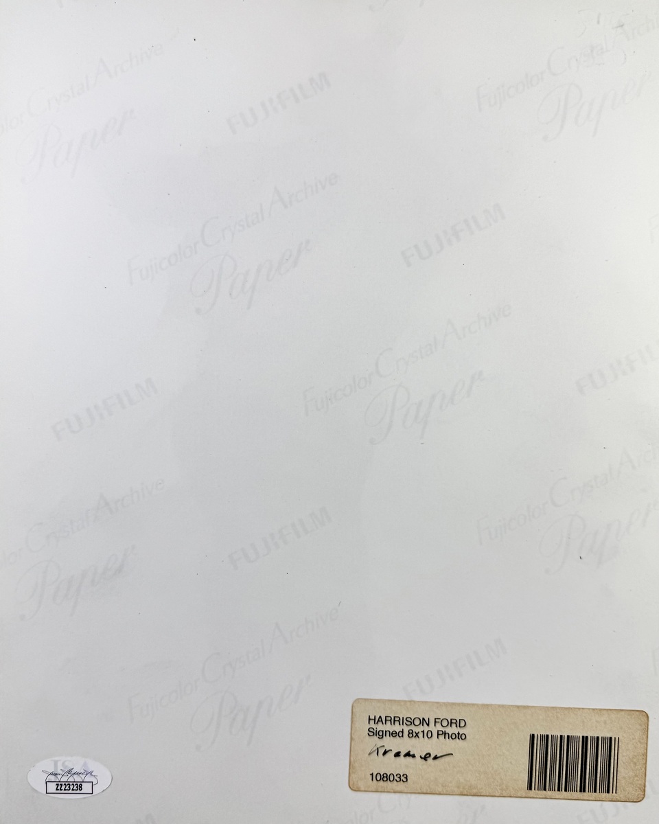 Harrison Ford autographed vintage 8"x 10" Indiana Jones photo signed in blue fibre tip marker. An iconic photo last authentic one sold for over 5K as seen in the scan in auction. This signature has been authenticated by JSA James Spence authentication Certification Number: ZZ23238 and will come with the Letter of Authenticity you see in the scans. This photo will come in a clear hard top load for display. Buy with confidence we have been selling autographs since 1992.