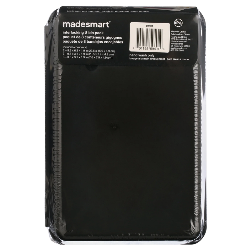 Keep your entire office organized with the madesmart Interlocking 8 Bin Pack. Neatly organize everything, from paperclips to highlighters. Use the small containers for storing rubber bands and other small items, while the larger compartments are great for storing pens, pencils, and larger office supplies. With this versatile drawer organizer, the possibilities are endless to organize all your office essentials.