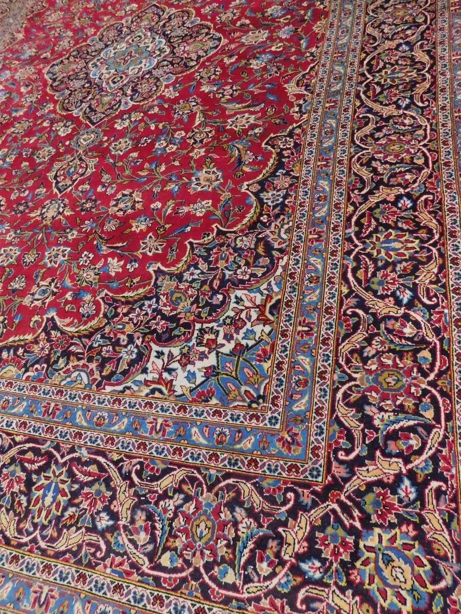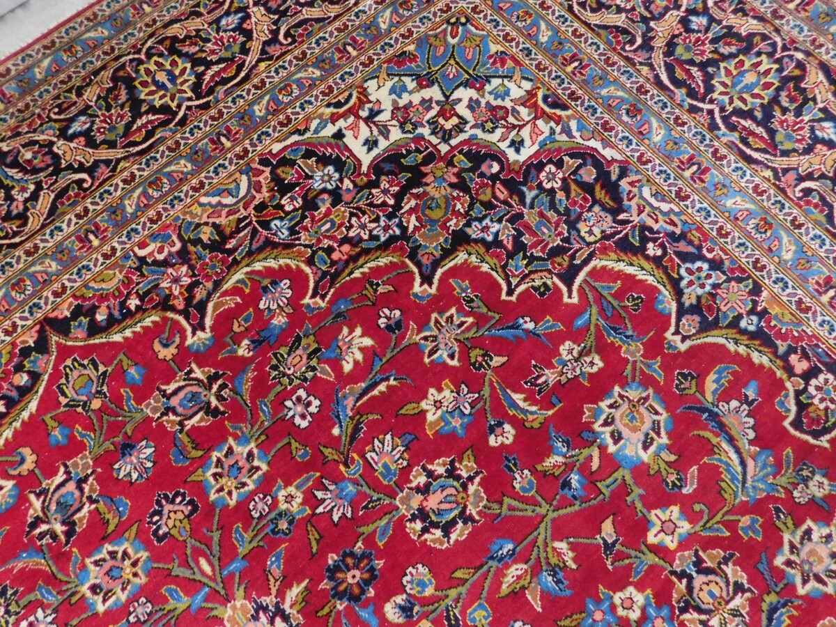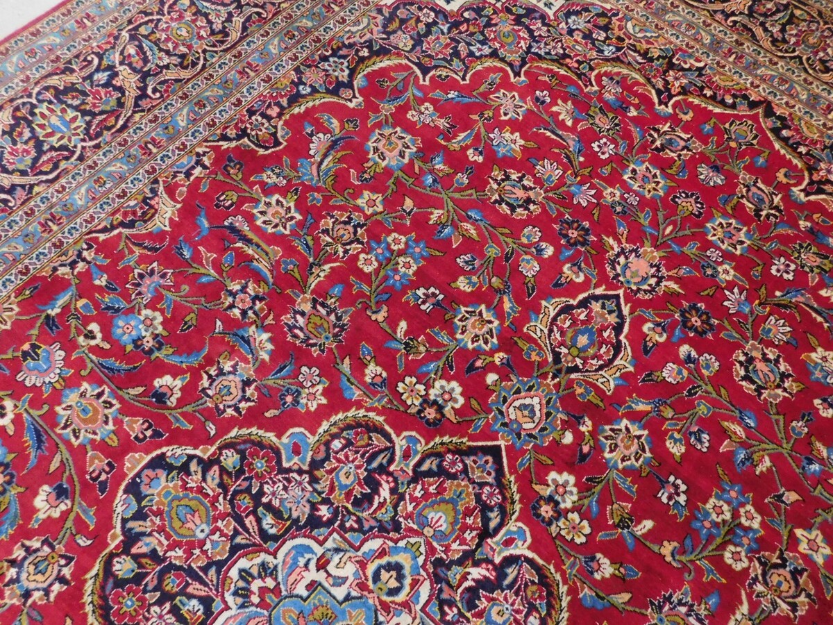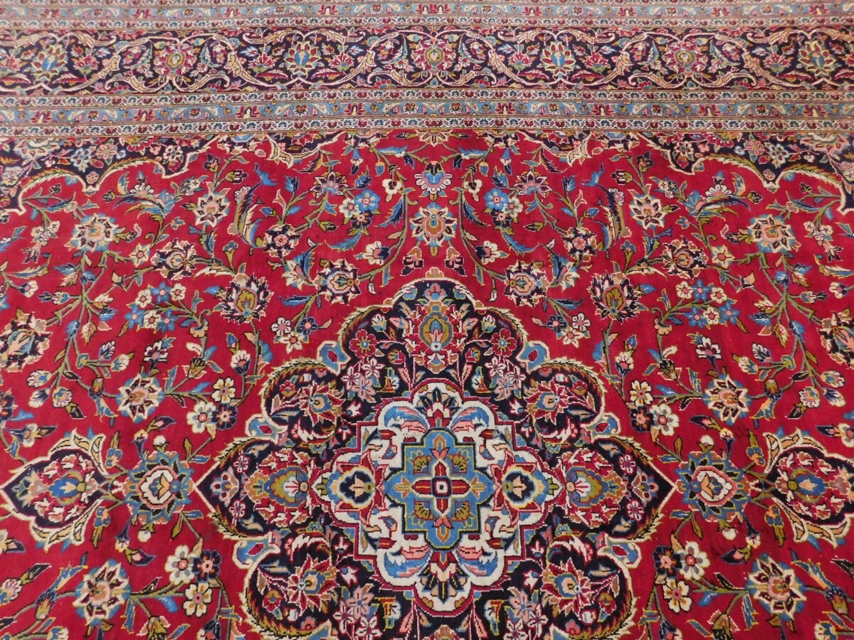 This handmade rug, measuring 9'8"x 13'8", features a medallion pattern and a classic rectangular shape, typical of mid-century designs. The rug is made of wool with a pile height of 0.25 inches, hand-knotted using traditional techniques. With its vibrant red color, this rug adds a touch of vintage charm to any room. Perfect for Christmas or year-round, this easy-to-clean rug from the 1960s is both functional and stylish, making it a unique and valuable addition to any antique collection.