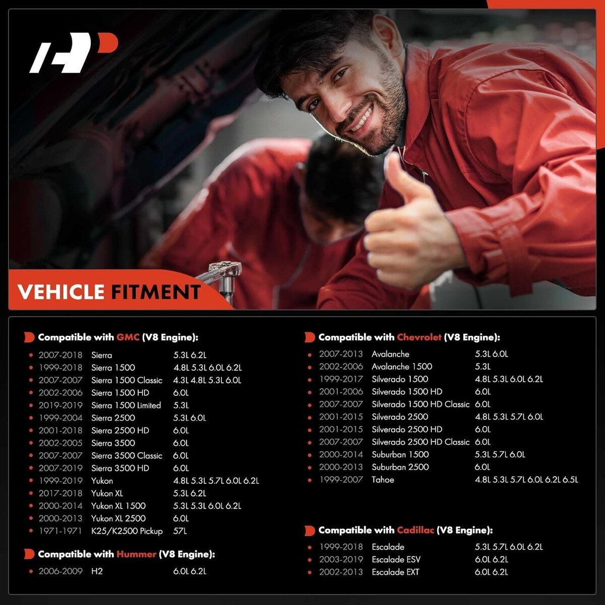 Compatible with GMC Sierra 2007-2018 // Sierra 1500 1999-2018 // Sierra 1500 Classic 2007-2007 // Sierra 1500 HD 2002-2006 // Sierra 1500 Limited 2019-2019 // Sierra 2500 1999-2004 // Sierra 2500 HD 2001-2018 // Sierra 3500 2002-2005 // Sierra 3500 Classic 2007-2007 // Sierra 3500 HD 2007-2019 // Yukon 1999-2019 // Yukon XL 2017-2018 // Yukon XL 1500 2000-2014 // Yukon XL 2500 2000-2013 // K25/K2500 Pickup 1971-1971 ---- V8 Engine