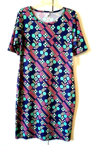 LuLaroe Womens Julia Bodycon Dress XXS Boat Neck Geometric Gold Purple Blue Pink