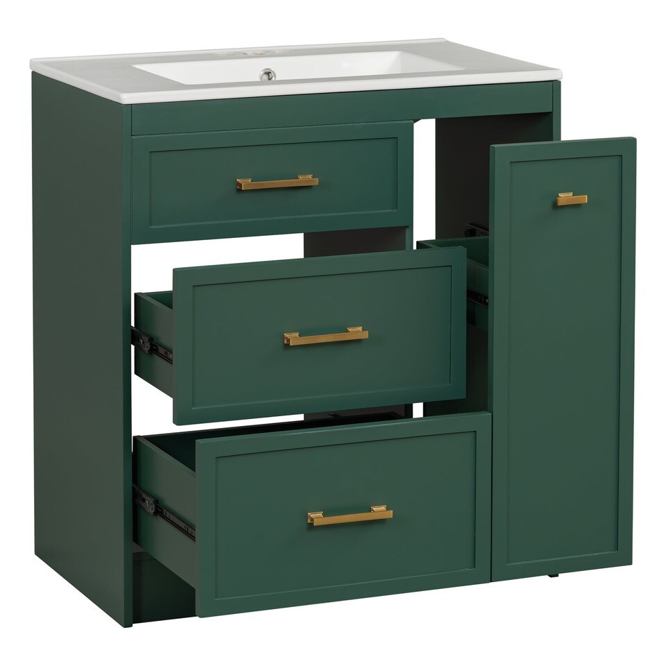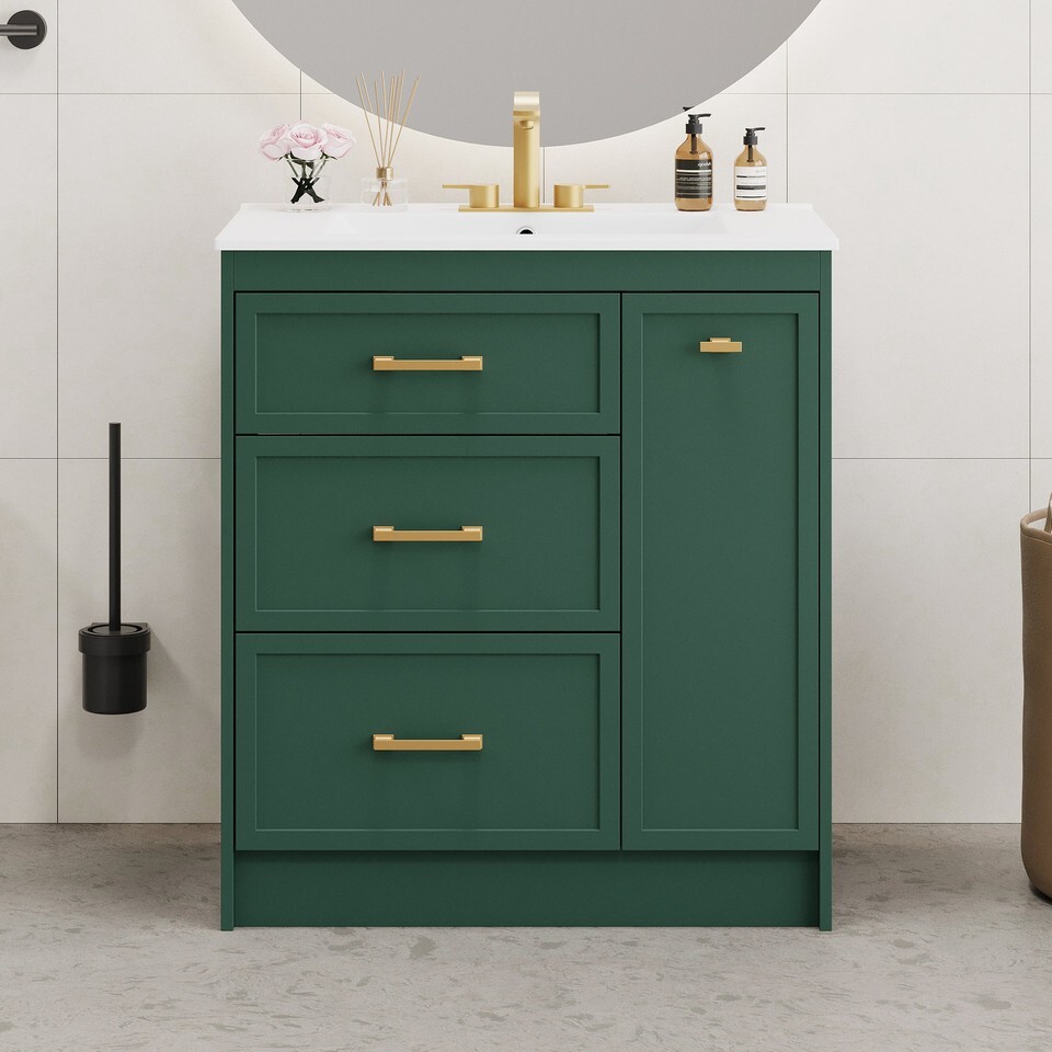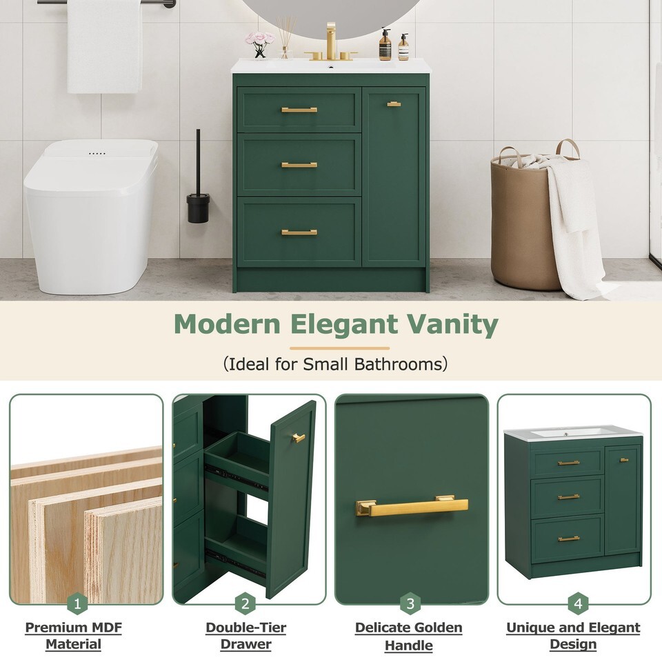 Transform your bathroom into a serene retreat with this 30' wide vanity, designed to elevate both space and style in smaller bathrooms. Its forest-green elegance and golden accents add a timeless sophistication, while the ceramic basin with overflow promises effortless maintenance and a clean, dry space. Every inch is crafted for functionality: a double-layer drawer and deep compartments offer ample storage, keeping essentials organized and within reach. Built with durable MDF, this piece embodies enduring quality, blending beauty and utility seamlessly. Envision the harmonya??where form meets function in your personal sanctuary.