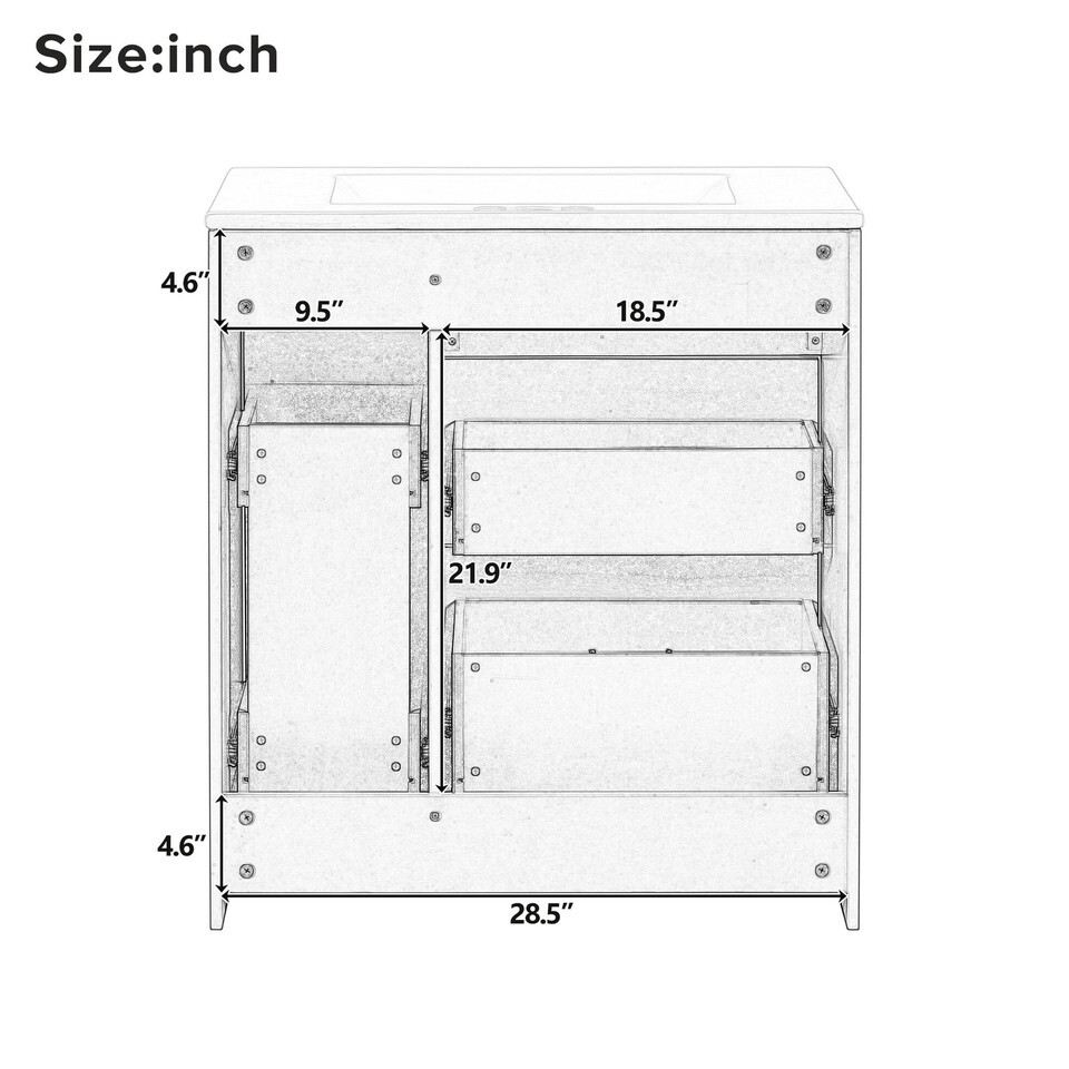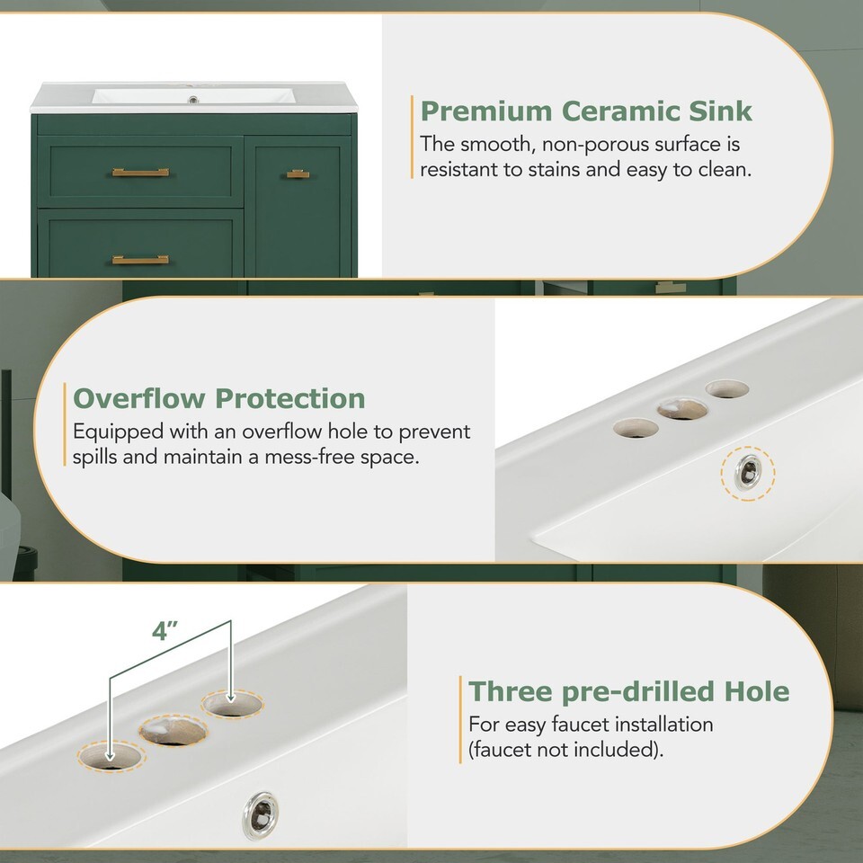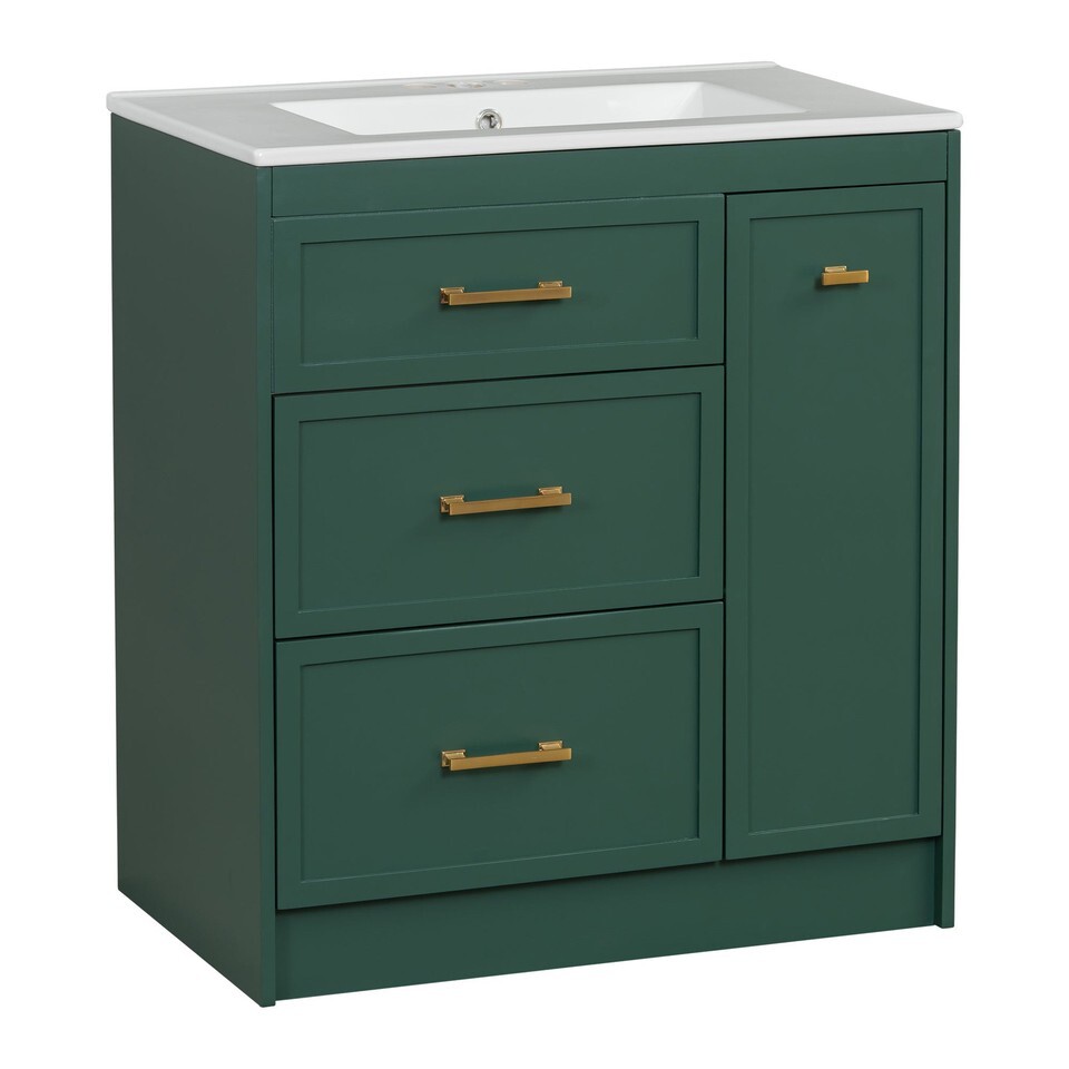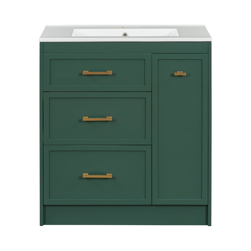 Transform your bathroom into a serene retreat with this 30' wide vanity, designed to elevate both space and style in smaller bathrooms. Its forest-green elegance and golden accents add a timeless sophistication, while the ceramic basin with overflow promises effortless maintenance and a clean, dry space. Every inch is crafted for functionality: a double-layer drawer and deep compartments offer ample storage, keeping essentials organized and within reach. Built with durable MDF, this piece embodies enduring quality, blending beauty and utility seamlessly. Envision the harmonya??where form meets function in your personal sanctuary.