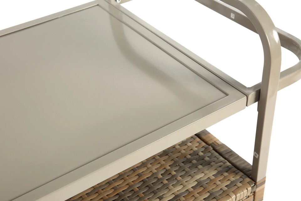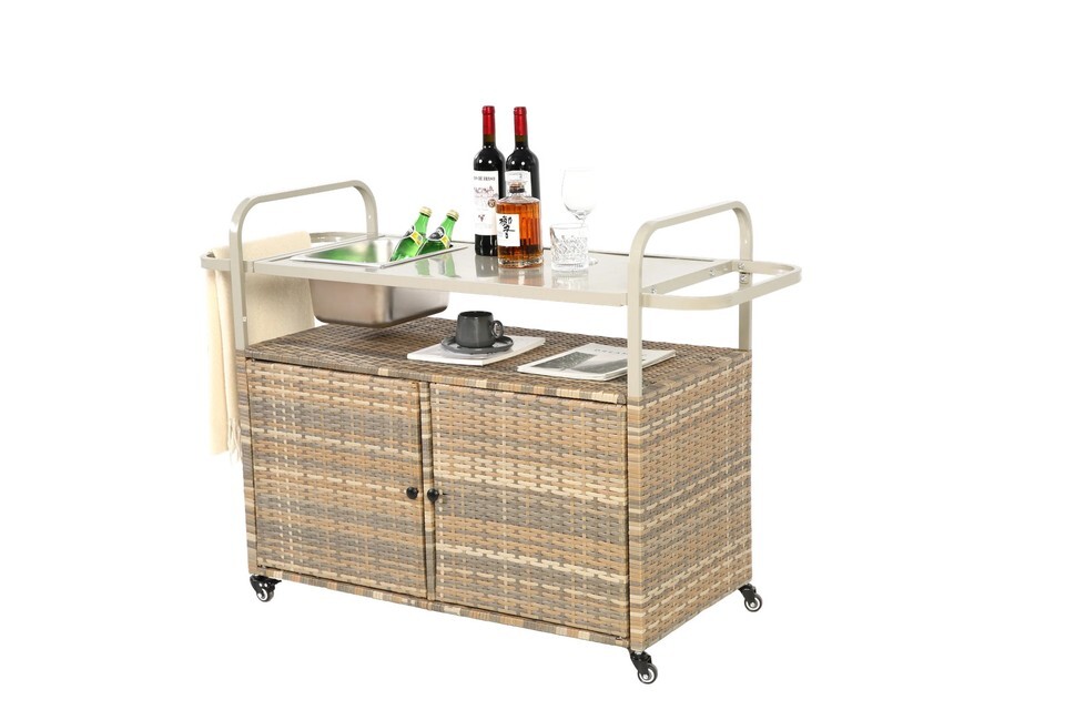 Outdoor Wicker Bar Cart: Ice Bucket, Cabinet, Steel Top, Wheels, Beige
