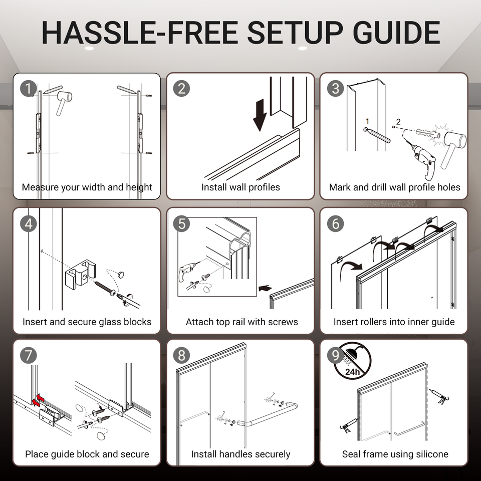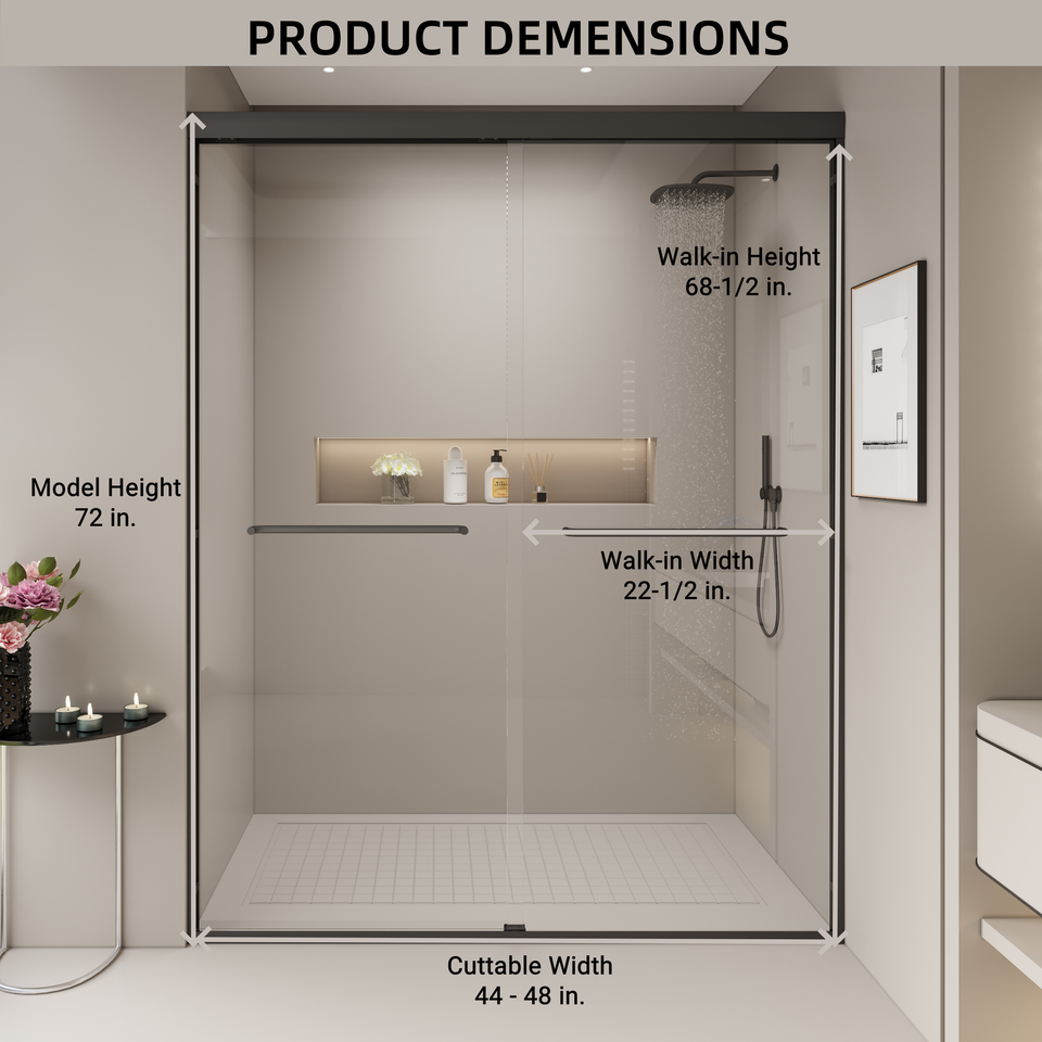 Customizable Dimensions: The double sliding shower door measures 48' W x 72' H, adjustable from 44' to 48' by cutting the guide rail for a tailored fit.