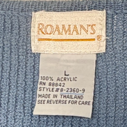 Roaman's Light Blue Knit Sweater Size L. Cozy light blue knit sweater. Ideal for layering. 100% Acrylic and Machine Washable. Armpit to armpit measures 24?. Shoulder to hem is 31?. Very Good Used Condition - See Photos for further description.