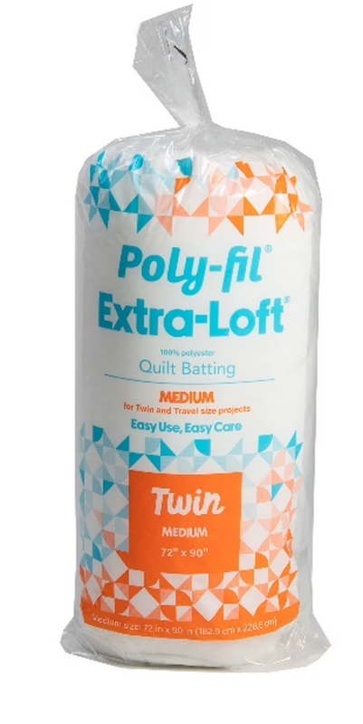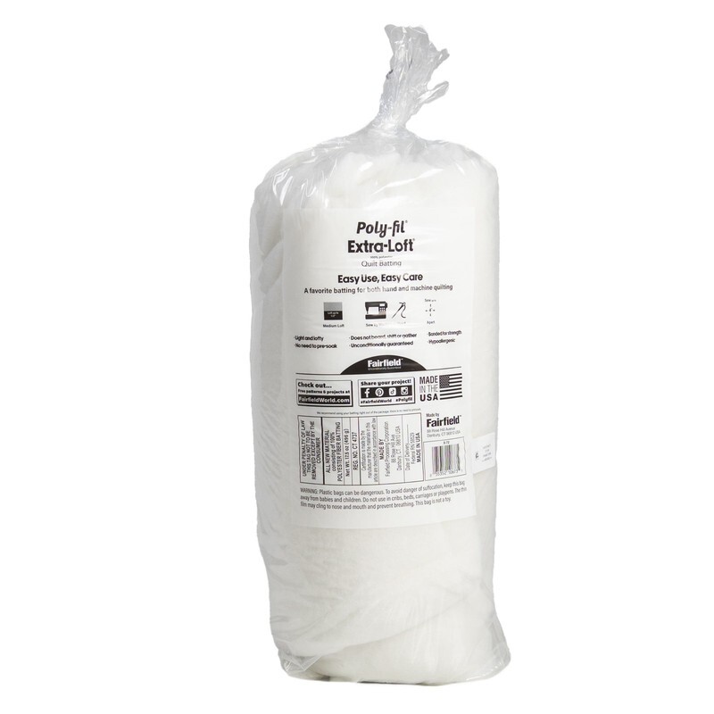 Begin your journey towards quilting mastery with Fairfield?s Poly-Fil Extra-Loft! This hypoallergenic, 100% bonded polyester quilt batting is perfect for machine quilting and hand quilting and has an even give in both directions. The lofty thickness of this breathable, lightweight batting offers noticeable relief during hand quilting, making it an excellent choice for newcomers to quilting. This quilt batting is ideal for a wide variety of projects, including bed quilts, baby quilts, lap quilts, and throw pillows. Craft with confidence, as projects created using this batting remain washable after quilting, ensuring long-lasting maintenance. The batting won?t beard or shift and will retain its shape after washing. Unleash your creative spirit and elevate your creations with this premium polyester quilt batting. It measures 72" X 90" and weighs 3.5 oz./sq. yd., making it suitable for twin and travel-size projects. The recommended quilting distance of batting is 2"?4" and it has a loft of about 3/8?.