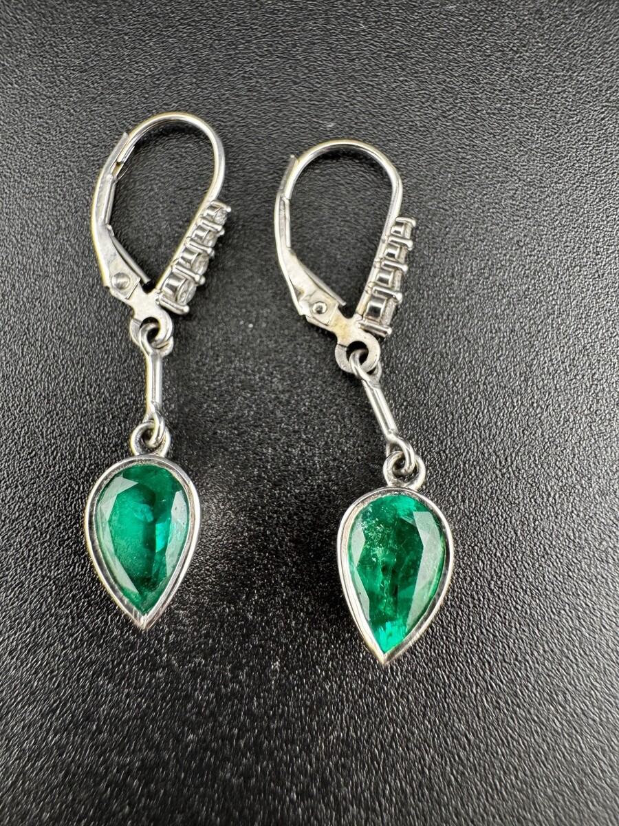 Classic custom-made 18K white gold emerald earrings featuring pear-shaped Colombian emeralds in elegant bezel settings. Each earring is designed as a solitaire emerald with three round diamonds on Euroback wire drops. The emeralds display strong green color and fine transparency, making these earrings suitable for both daily wear and formal occasions.