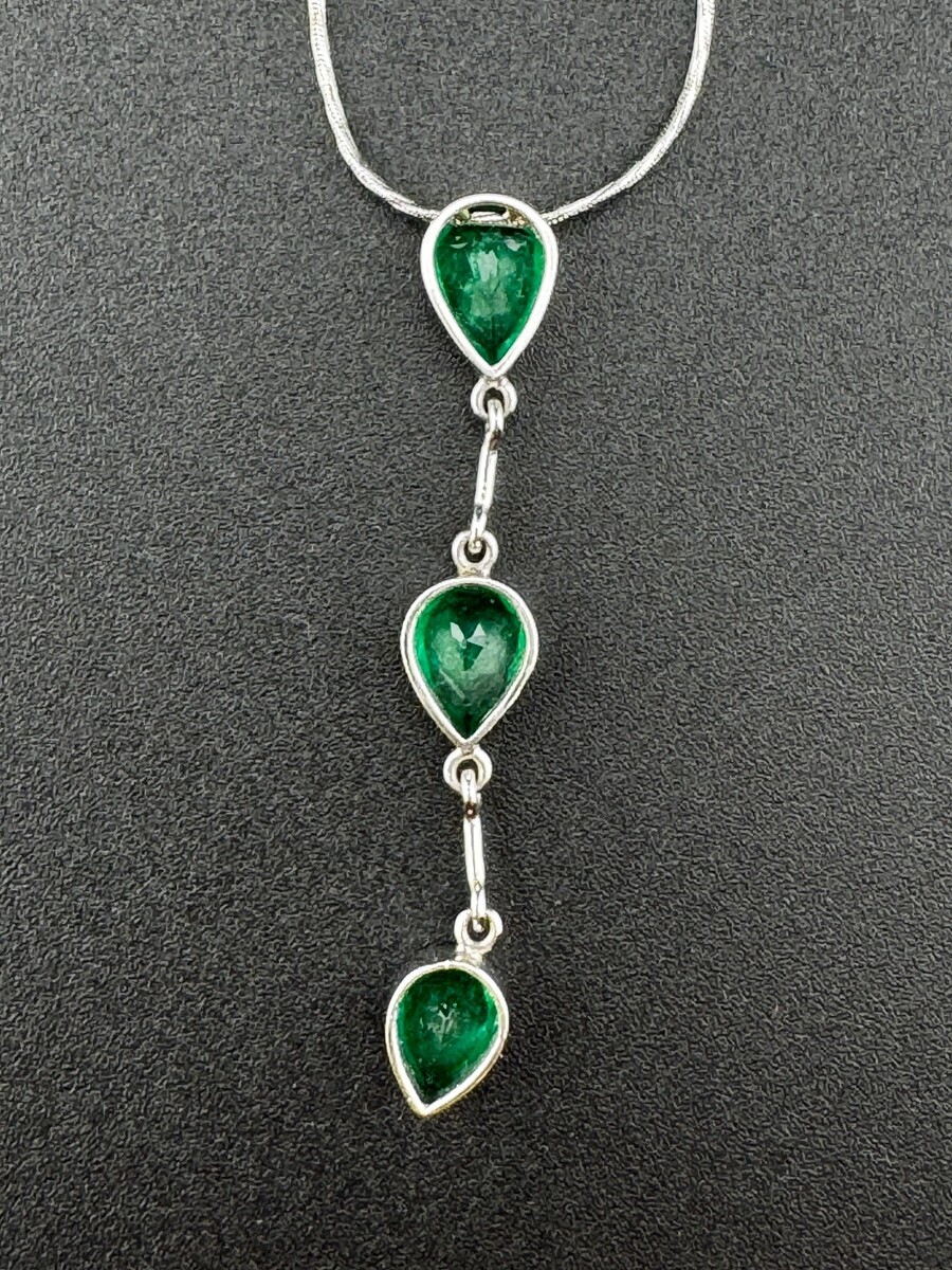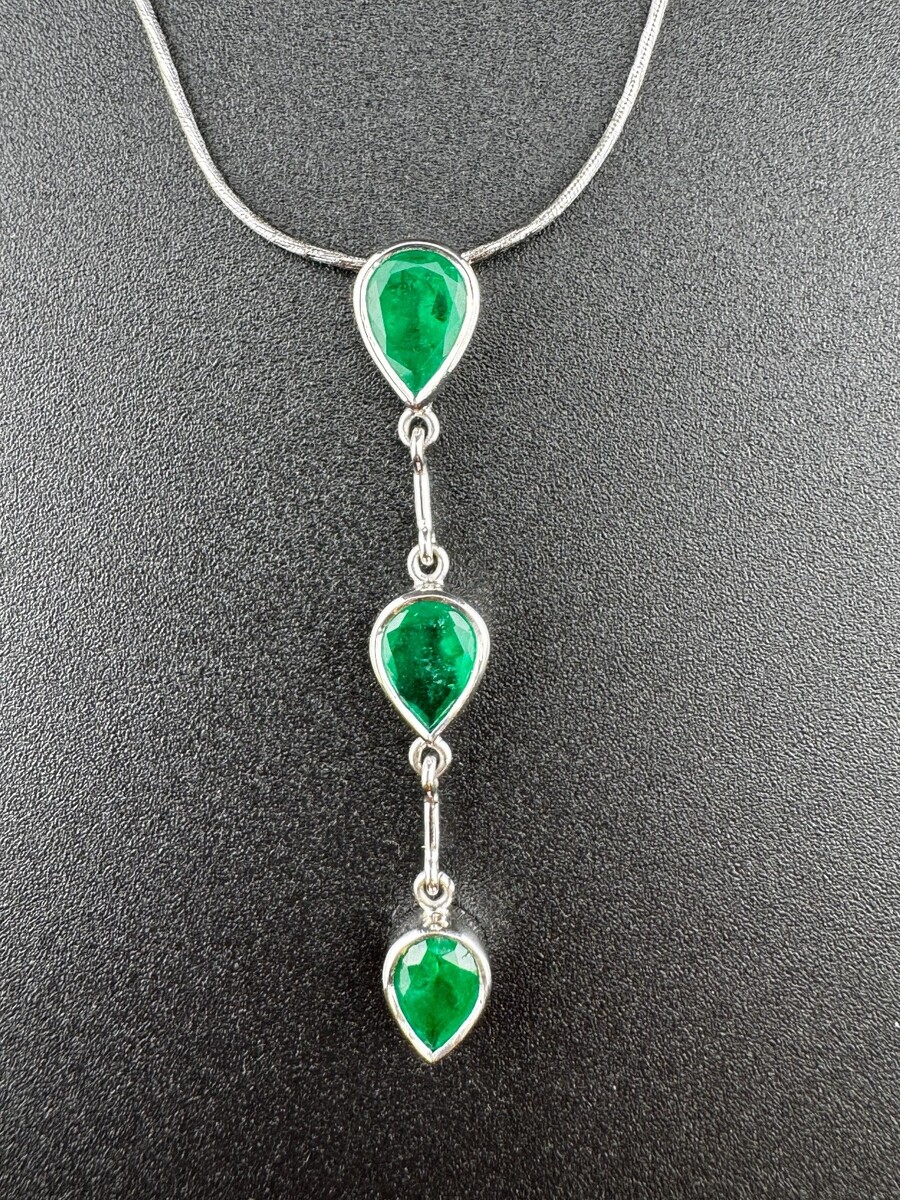 Elegant custom-made platinum emerald drop pendant necklace featuring three bezel-set pear-shaped Colombian emeralds, graduating in size and separated by delicate wire bar spacers. The pendant presents a refined vertical drop design and is paired with a machine-made diamond-cut finished 18K white gold snake link chain, rhodium plated for a bright white finish.