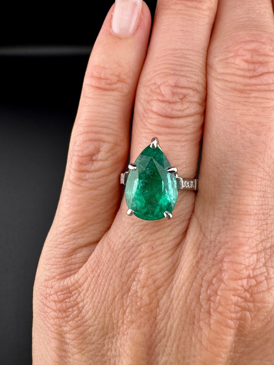 Elegant custom made designer platinum emerald and diamond dinner ring by S. V. Rudle. This classic-style ring features a striking natural pear-shaped emerald in a five-prong wire basket setting, accented by ten round brilliant cut diamonds bead set into the shoulders. A refined cathedral-style mounting highlights the center stone beautifully.