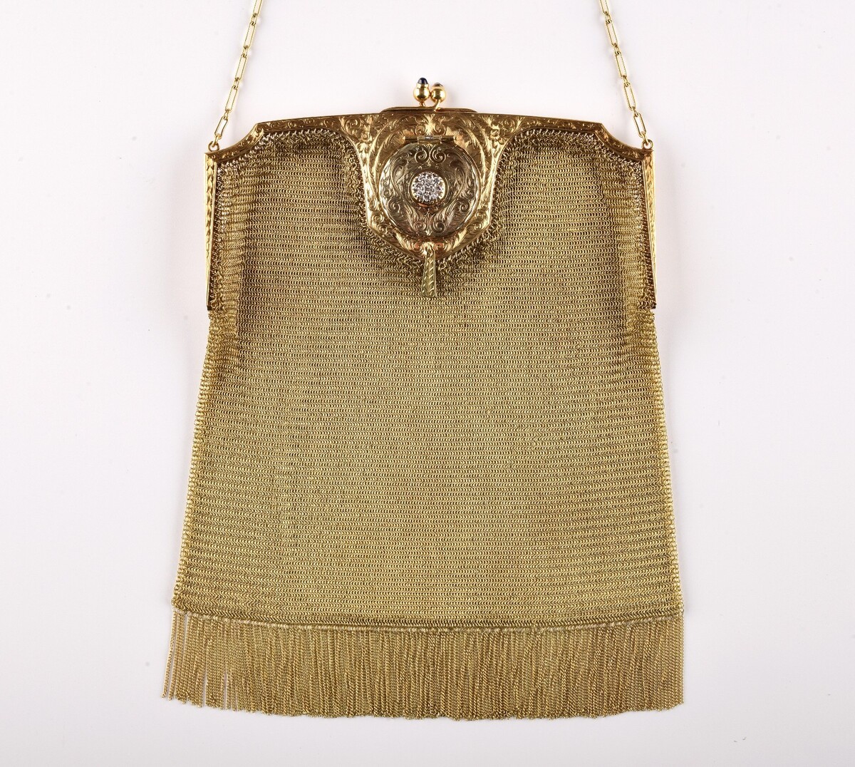 *Whiting & Davis Co. 14k Yellow Gold Mesh Bag w. Diamond Sapphire And Locket