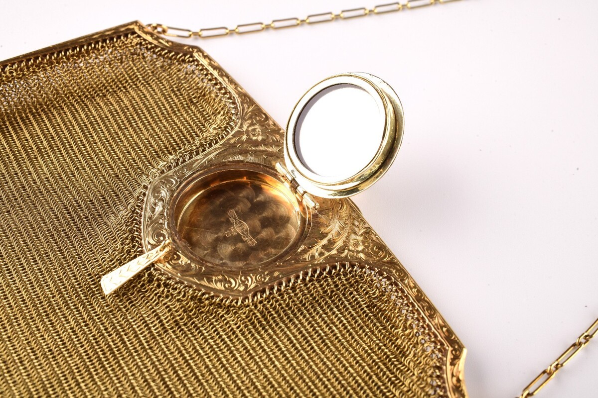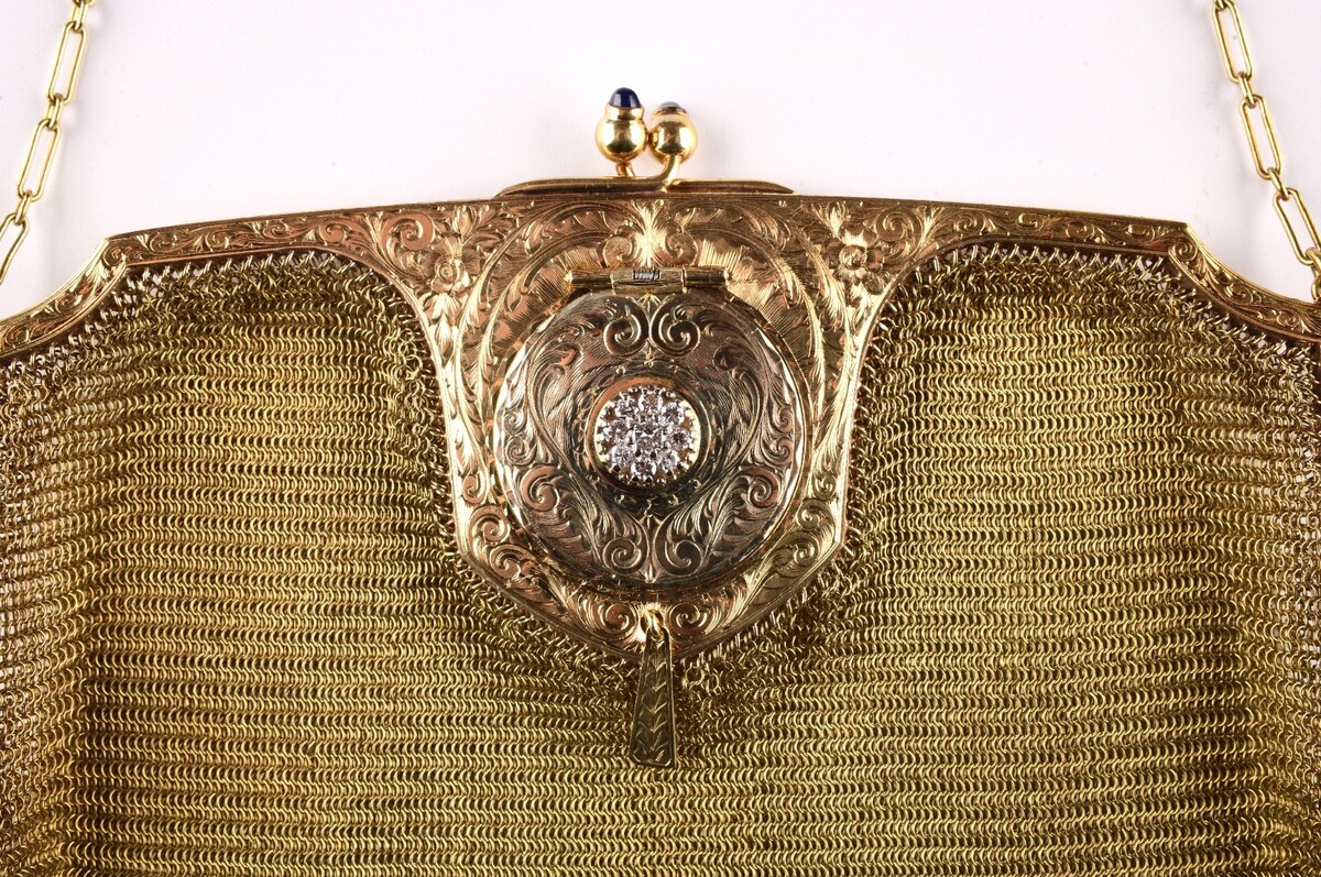 The body of the bag is made from finely woven real 14k gold mesh. The lock is decoratated with sapphires. There is also a quarter size locket decorated with 9 natural diamonds and a tiny mirror inside. Made in the United States, this original piece exudes sophistication and is sure to make a statement for any woman looking to add a touch of vintage glamor to her outfit.