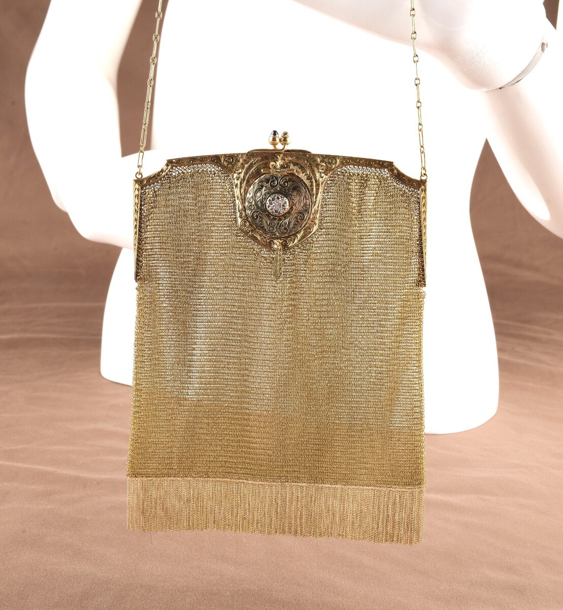 The Whiting Davis Co. Mesh Bag is a luxurious vintage accessory perfect for a special occasion like a Little Black Dress. This evening bag features a beautiful diamond, sapphire, and locket detail, all set in the elegant art nouveau style.