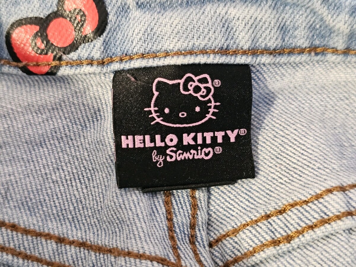 The product is a pair of women's jeans from Sanrio's Hello Kitty collection. The jeans feature a floral pattern and are made of a cotton blend denim fabric in a light wash. They have a regular fit with a high rise and a size 7 waist. The jeans are machine washable and come in a blue color with Hello Kitty logo accents. The design includes a 5-pocket design with a stretch feature for added comfort and flexibility.
