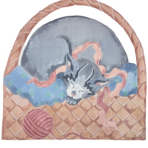 Needlepoint Canvas Hand Painted Gray Cat Sleeping Basket Of Yarn May June