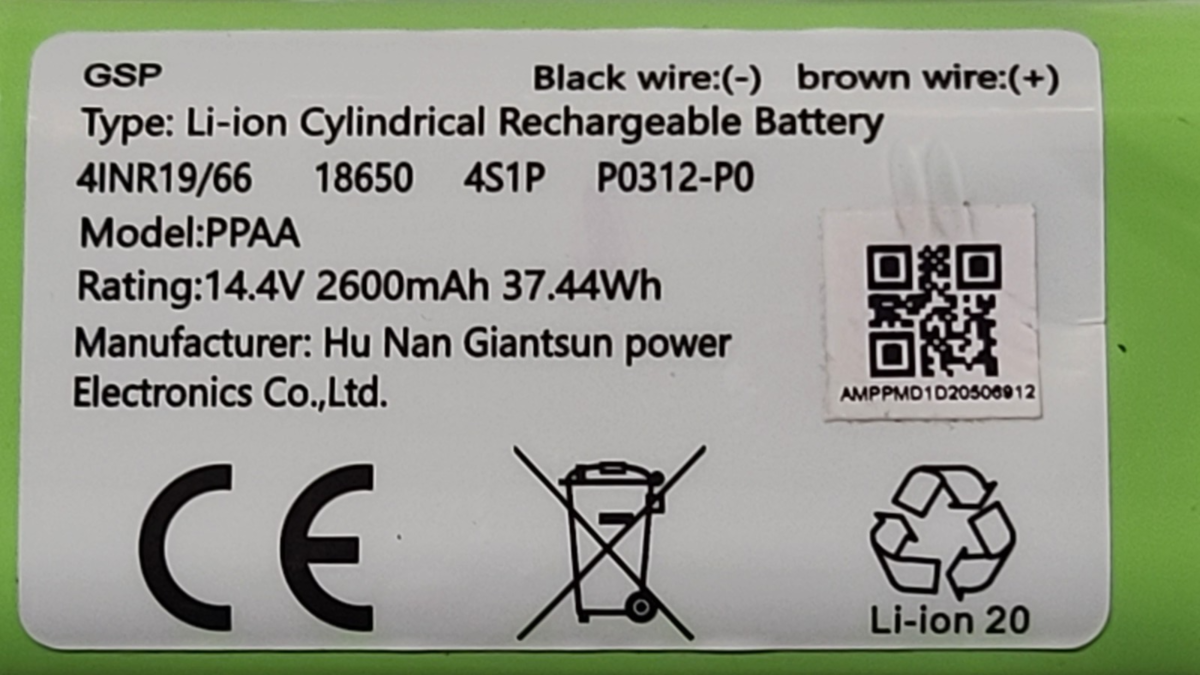 OEM replacement battery for the Eufy Robovac 25C, built to restore cleaning performance and runtime. This rechargeable Li-ion pack (Model PA04) provides 14.4V, 2600mAh, and 37.44Wh with reliable 18650 cylindrical cells in a 4S1P setup. Manufactured by Hu Nan Giantsun Power Electronics Co., Ltd. with a 2025 date code, it includes the correct 4-pin connector for easy installation.