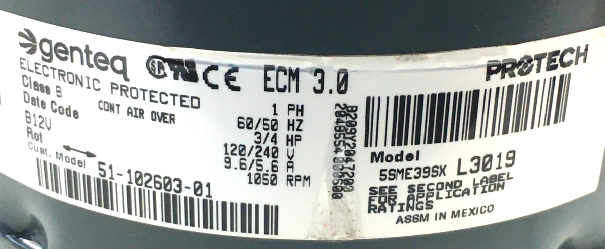 This is Genteq 5SME39SXL3019 ECM 3.0 GC09 Programmable Blower Motor Rheem 51-102603-01 120/240V 3/4HP 1050 RPM CCW Lead End rotation, used part.