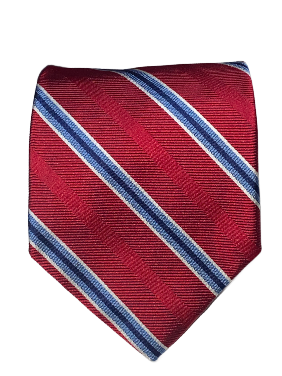 Color and pattern: Deep red background with diagonal blue and white striped design in a classic repp weave.