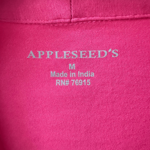Appleseed?s Prima? Cotton Solid Narrow-V Tee. The color is called deep rose but to me it is very raspberry colored. The fit is slightly boxy and the sleeves are three-quarter length. Cotton and spandex blend. Laying flat measures approximately 24.5 inches shoulder to hem and 20.25 inches armpit to armpit. No noted flaws.?