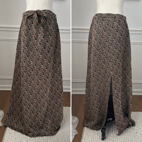 70s maxi skirt. No tags. I think the fabric is Lurex because it has sparkly metallic gold threading throughout an abstract fabric of black, muted gold, green, blue, red, and purple. Fabric is lightweight and has stretch. Measurements are approximate and taken while laying flat: the larger skirt has a wide elastic waist that measures anywhere from 11inches relaxed to 15inches without much resistance 18.5 inches across the hip and 40 inches long. There is a 21.5 inch vent in the back for easy movement and a removable sash. Based on these measurements, I estimate this to be approximately a modern size small but please double check measurements to ensure the proper fit for you.