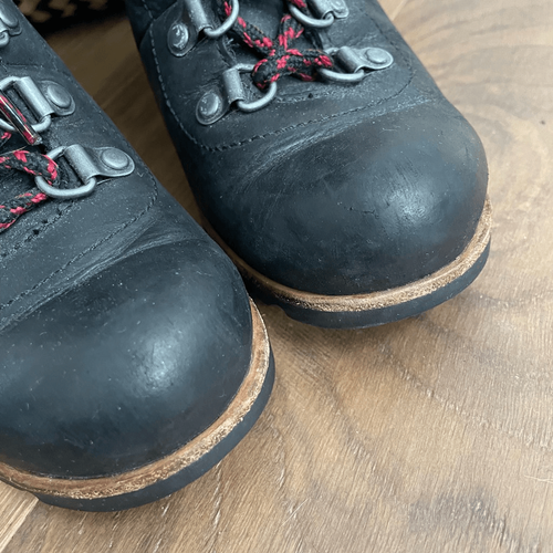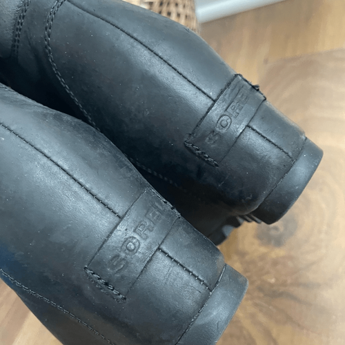 Very Gently preowned Sorel women?s conquest, wedge waterproof snow boot in black with dark gray accents and black and red laces. Maintain your style in heavy snow with the Women's Conquest Wedge Waterproof Snow Boots from Sorel. Function meets fashion with these Black and Dark Grey comfortable and waterproof boots. Made with waterproof premium leather upper and Sorel's most comfy wedge; featuring a padded ankle collar and fun ?hiker? inspired laces that deliver protection and style. UPPER: Waterproof full-grain leather and pigskin collar. Microfleece lining.
