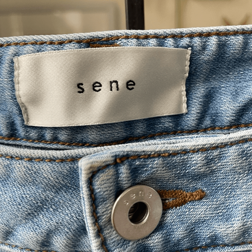 Sene Studio light blue wash low rise cropped jeans. Button and zip closure with branded hardware and brand tab off the back pocket. Laying flat measures 18.5 inches straight across the waist with a 9.5 inch rise 23 inch inseam. $200 retail.