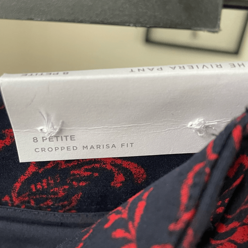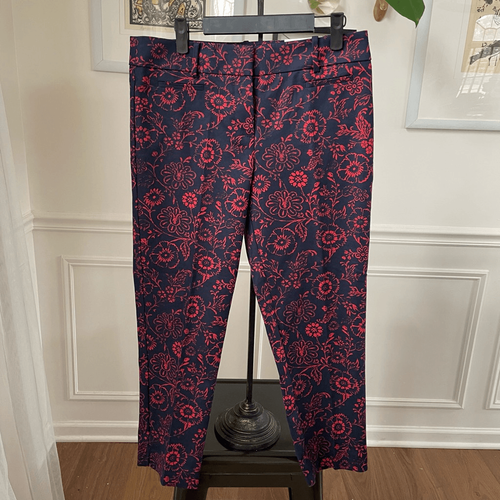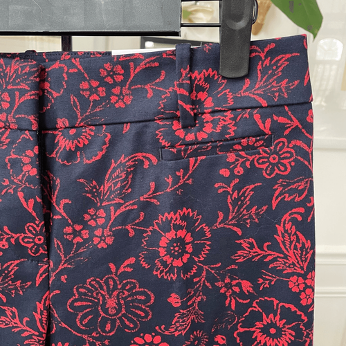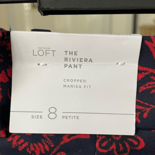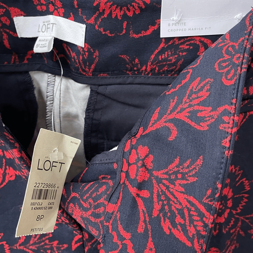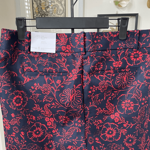 New tags Loft cropped riviera pant. Marisa fit. Petite sizing with double hook and zip closure. Welt pockets. Notched ankle. Cotton, rayon and spandex blend. 23.5 inch inseam with a 9.5 inch rise and 16.5 inches straight across the waist. Dark blue with batik style red floral print.
