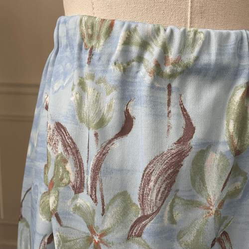 Vintage 70s A-line floral print polyester skirt with elastic waist. Laying flat measures 10.5? straight across the waist, relaxed, stretching to 14 inches without much resistance. 25 inches long. Fabric does have stretch. The only tag says size 8, but that is vintage sizing. Measures closer to a modern size small and is featured on my size small dress form for scale.