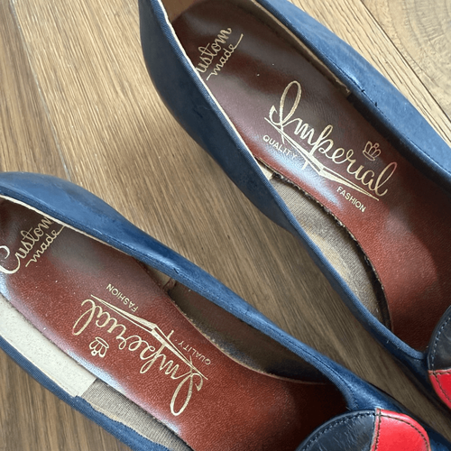 Yeah, Baby! These shoes are so Austin Powers. 60s/70s imperial custom-made navy blue heels with black, red and gray accents. All man-made materials. Marked size 7. 2.5 inch heel. 3 inches straight across the ball of the foot and 9.75 inches from heel to toe on the inside. Some minor scuffing to the glossy heel and the Navy blue ?leather? could use a little polish, but could easily be worn as is. So cool!