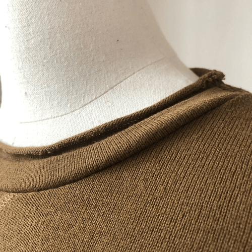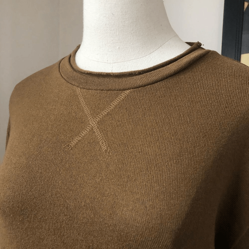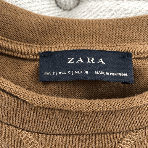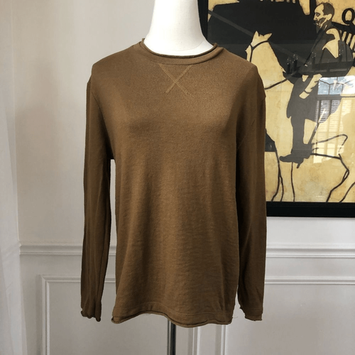 Zara size small lightweight crewneck sweater with raw rolled edges at neck, cuff and hem. Measures approximately 24 inches from shoulder to hem and 19 inches from armpit to armpit. Dijon-y brown color- rich brown with warm gold undertones