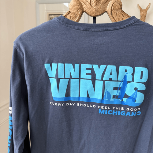 Vineyard vines, long sleeve pocket T-shirt with, ?every day should feel this good Michigan? on the front pocket and print large across the back with sailboat logo. Michigan is print down one sleeve with the signature whale. Laying flat measures 27 inches shoulder to hem and 21 inches armpit to armpit.