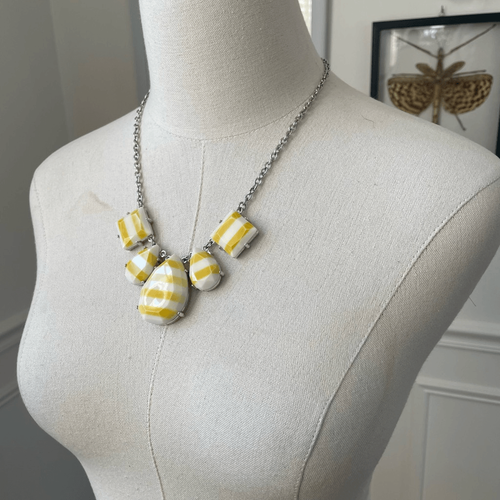 New with tags Versona yellow and white striped cobachon necklace on silver tone chain with lobster claw fasten. this fashion necklace is made out of what feels like plastic composite gems so they are lightweight but still a fun and interesting fashion necklace to accent your wardrobe