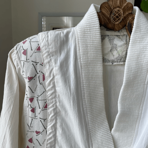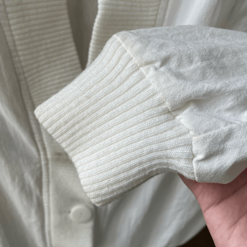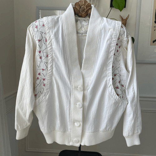 Vintage 80s Inner View button Vneck cardigan. Cotton and polyester blend lightweight nubby fabric with 4 large white button closure. Dolman cut, with the inverted triangle cut the 80s was famous for. Ribbed knit waist and cuff. Geometric triangle print fabric where the torso meets the sleeves, wrapping from the front to the back. The triangle pattern is mauve pink and gray on white. It is separated by a fan or a flap that hides the hip pockets. The effect is a little space age, which was also another 80s trend. Very New wave. Made in Hong Kong, tag size medium. Padded shoulders, of course. Laying flat measures 26 inches shoulder to him, 25 inches armpit to armpit and 19.5 inches straight across the bottom seam. This thing is so much fun.