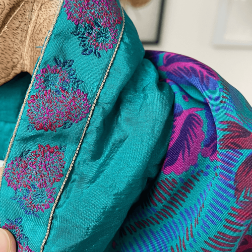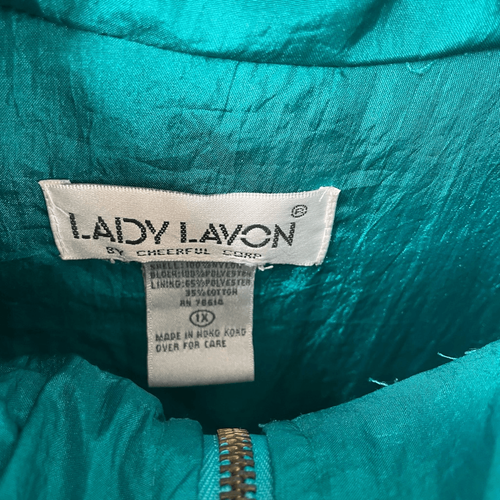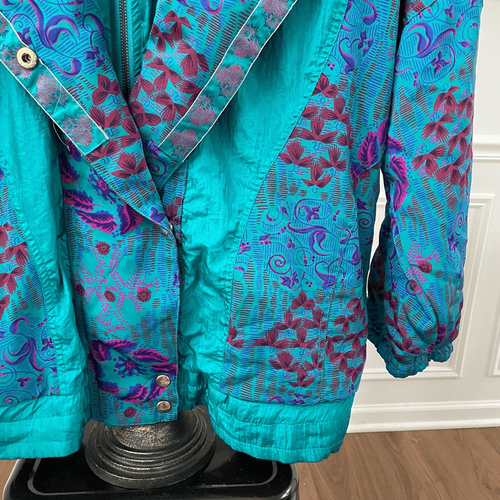 Plus size alert! If the 90s were a jacket, this would be it. Lady Lavon polyester satin teal, deep red, magenta, and purple color block and print jacket with on seam hippockets. 100% polyester satin layered look, but it?s really one piece with an interior full zip and a exterior shawl collar with adjustable straps. Where the collar wide or zipped up to protect your neck from the elements. Iconic 90s silhouette that is relaxed through the shoulders and chest, tapering towards the waist. The elastic at the hem and cuff is not quite as stretchy as it once was, but it really doesn?t affect wear. Laying flat measures 28 inches shoulder to hem and 27 inches armpit to armpit. 24.5 inches straight across the waist. Lined with polyester and cotton T-shirt material. no noted flaws. Tag size one X but please double check measurements to ensure the proper fit for you.