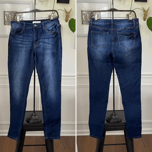 KanCan midrise, skinny jeans and a darker blue wash. Button and zip closure. Laying flat measures 14.5 inches straight across the waist with a 10? rise and just shy of a 30 inch inseam.