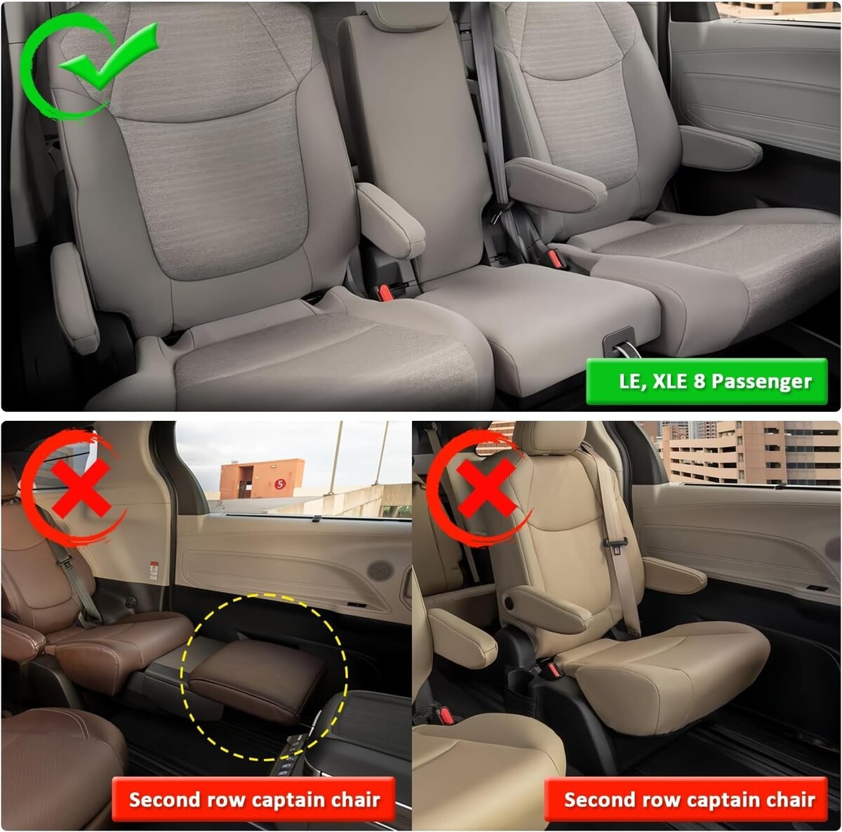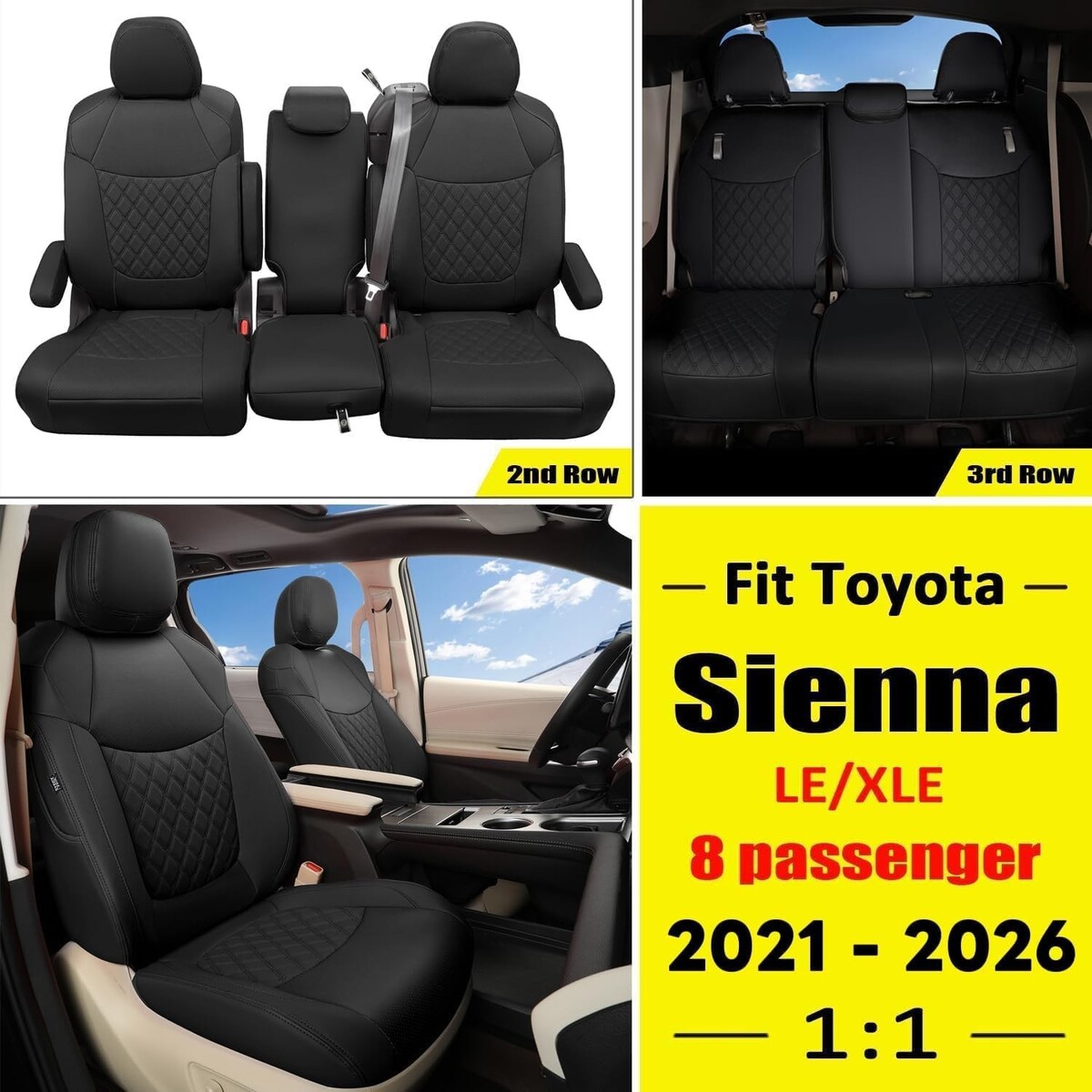 A custom fit full set of seat covers for Sienna LE XLE 8 passenger three row model,which perfectly fits the original seat like a glove.It is a perfect and cost-effective solution for you to update the car interior.