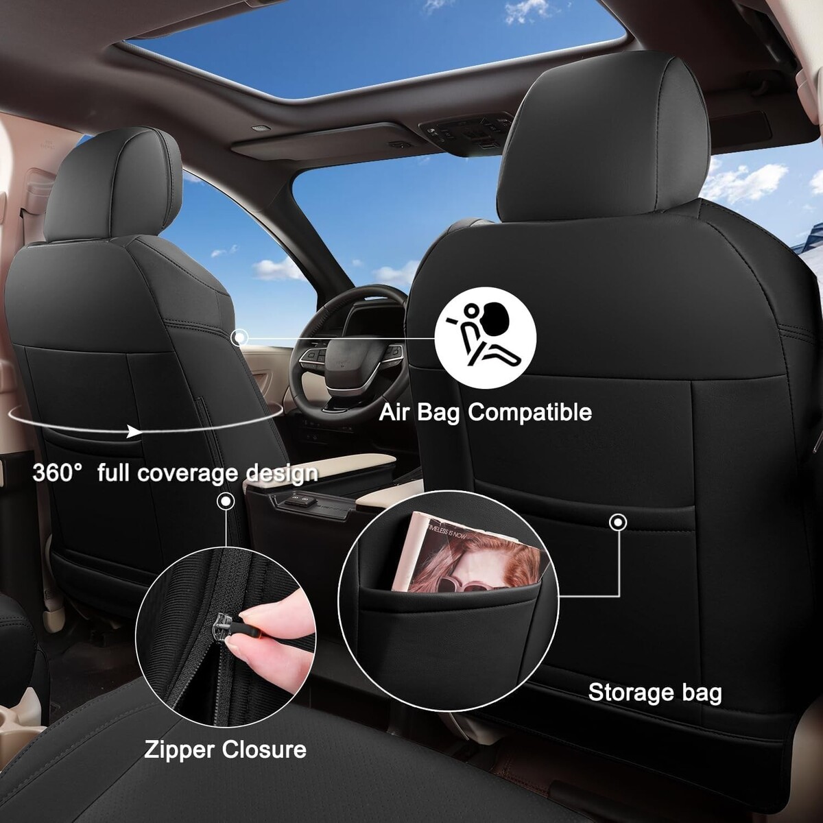 These car seat covers are made of soft leatherette, which is comfortable to the touch, has good breathability, durability, water resistance, and is easy to clean.