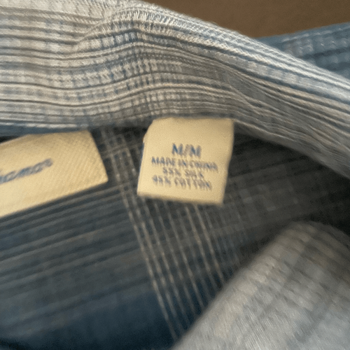 Tommy Bahama men?s two-tone blue plaid short sleeve button up shirts in cotton and silk blend. Single chest pocket. Laying flat measures 28 inches shoulder to hem and 21.5? armpit to armpit.