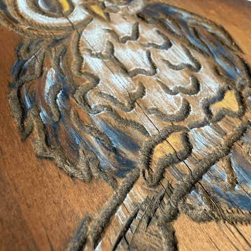Vintage late 60s early 70s decorative wood plaque with a large eyed owl carved into it and painted lightly with white and blue. Signed on the back with the person?s name, country carved by, grand Blanc, Michigan, and a phone number. Hanger on the back. Measures approximately 7 inches tall and 6.5 inches wide.