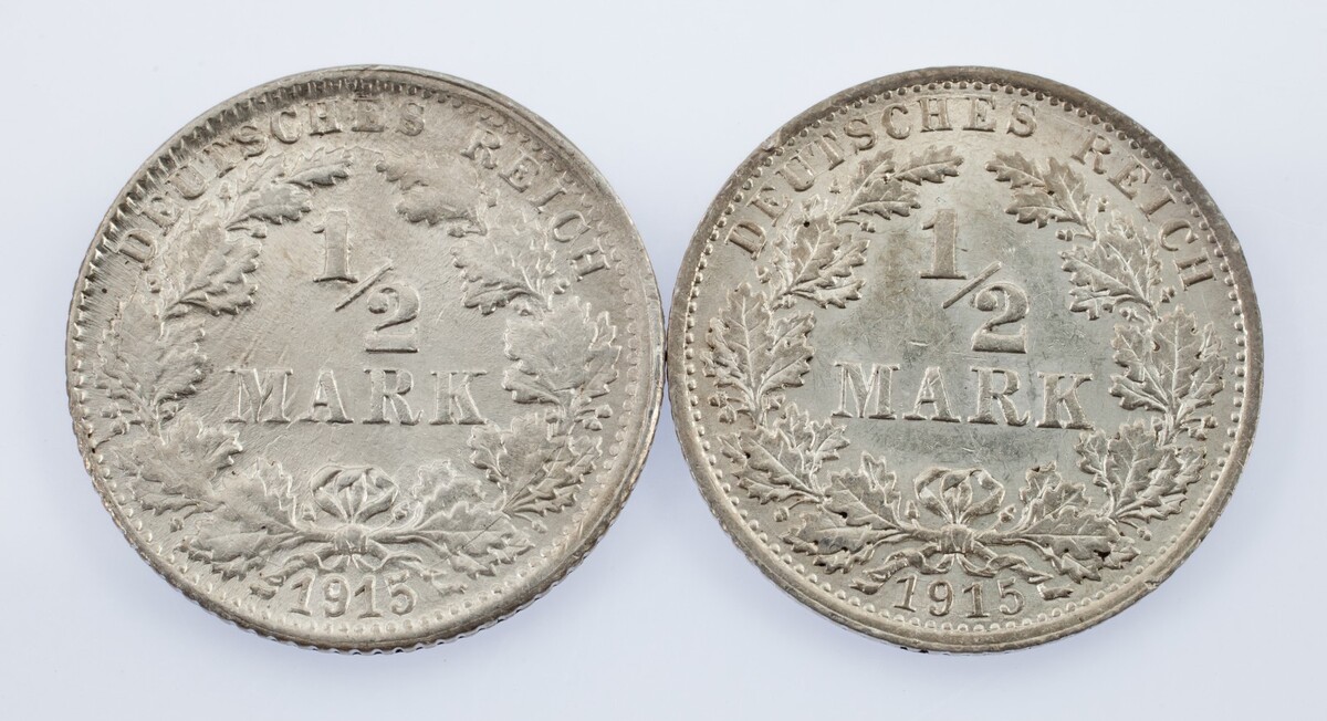 Lot of 2 German 1/2 Mark Coins (1915-A and 1915-F) AU - Uncirculated KM #17
