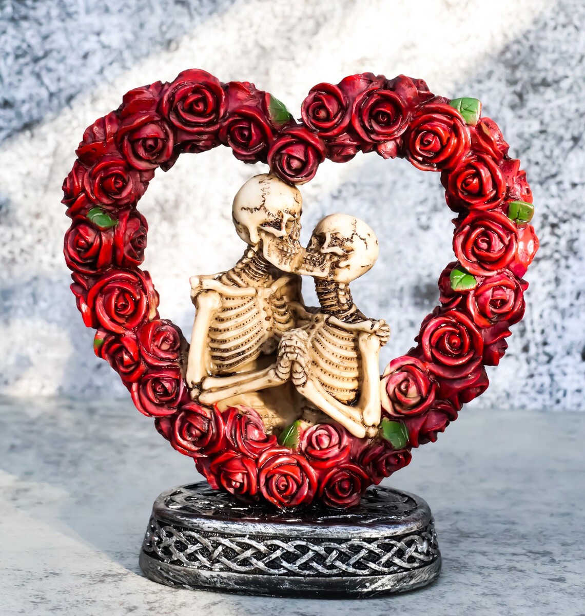 ? This Love Never Dies Wedding Skeleton Couple in Red Roses Wreath figurine is made of designer composite resin, hand painted and polished individually. Color Tone may vary