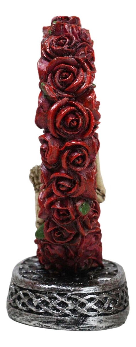 ? This Love Never Dies Wedding Skeleton Couple With Red Roses Wreath figurine is 4.75" tall, 4.75" long and 2" deep approximately. The sculpture weighs about 10 ounces.